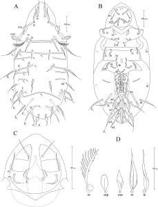 Notogaster — (Figure 1A) Lateral margins parallel in anterior half, posteriorly rounded. Transverse bands weekly developed, bands S 3- S 7 and S 9 incomplete and interrupted medially; S 6 incomplete on each side. Band S 8 complete. Lyrifissures hardly discernible: ia located laterally, at the level epimeral setae 3c; im located dorsally, next setae e 2; ip laterally, in the middle part of notogaster; ips ventrally, next to preanal plate and ih between setae h 3 and p 3 (Figures 1A-B).