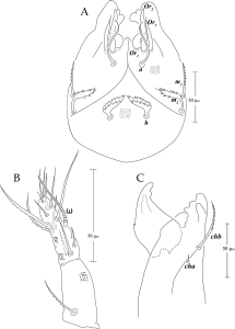 Gnathosoma — Chelicerae and palps are very similar in appearance to those of L. lanceolata Grandjean, 1950. Subcapitulum with setae h (29) phylliform, strongly dilated with serrated margins, m 2 (37) longer and thinner than h and both setae have spiculate surface, setae m 1 (42) setiform and slightly ciliate, setae a (50) setiform and smooth. Three pairs of adoral setae, or 1 (26) more or less triangular; or 2 (40) long, setiform, thick and smooth; or 3 (33) setiform, smooth and pointed, shorter than or 2 (Figure 2A). Palptarsus with solenidion longer than segment (Figure 2B). Cheliceral setae chb (43), long, setiform, slightly serrated; seta cha (5) very short and thin (Figure 2C).