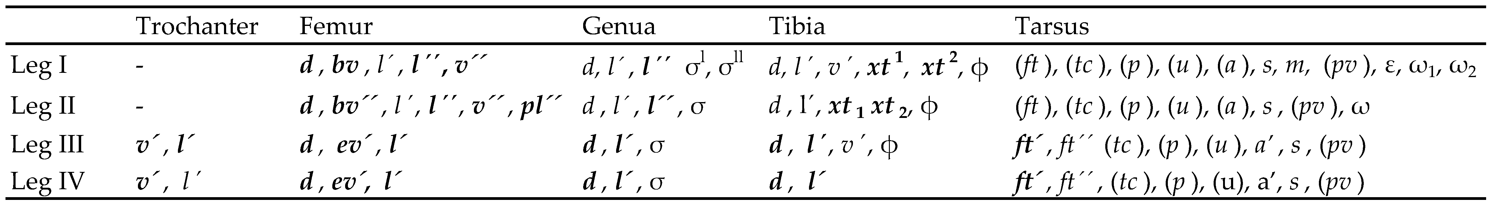 Epimeral region — Apodeme 1 complete, with two sternal extensions medially; apodeme II incomplete medially; apodeme III complete with short central extension directed posteriorly; apodeme IV complete, uniform. Epimeral formula: 3-1-3-4, all setae strongly dilated with spiculate surface; setae of median row (1a to 4a) shorter and smaller than those of the lateral rows.