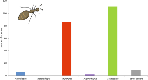 From not further determined “ants”, 51 scutacarid species have been reported: Archidispus haarloevi (Karafiat, 1959), 13 Imparipes species, Pygmodispus calcaratus Paoli, 1911 and 36 Scutacarus species (e.g. Karafiat 1959, Mahunka 1981, 1986, Dobrev 1992; for other references see Annex V). For all other reports of associations between ants and Scutacaridae, at the least the subfamily of the host was given. Most scutacarid species occur together with Formicinae and Myrmicinae (Figure 12; Annex VI, VII).