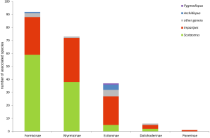 Anticipatory it can be stated that by far most scutacarid species can be encountered in association with ants (Formicidae) (Figure 6) and that the prevailing types of associations vary between the different host groups (Figure 7). The subchapters give information on the number of associated scutacarid species of the host taxa and, if available, details on the associations and possible biological backgrounds. The included annex is ordered according to the hosts, giving information on the associated scutacarid species, the type of association (inquiline, phoront, or both), the geographic range and occasionally other interesting remarks (for example, other known habitats of the mites, like soil or moss). In another table available in the online supplementary material, the same information is organized the other way round, listing the scutacarid species first and adding the reported host taxa for each species afterwards.