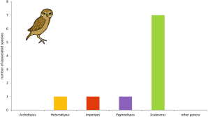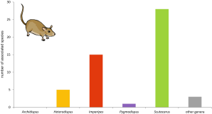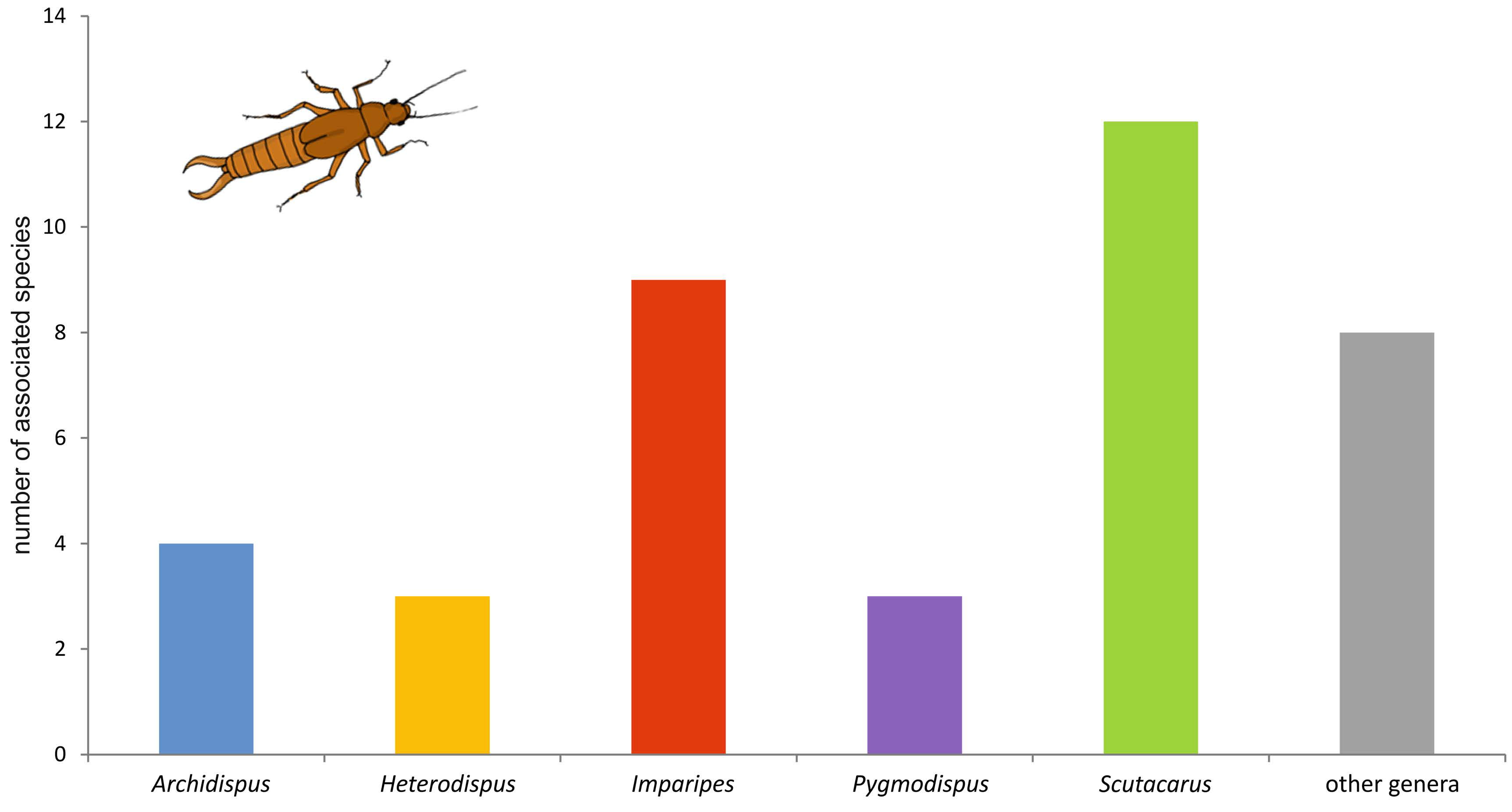 The genera Diversipes, Lamnacarus, Lophodispus, Nasutiscutacarus, Parascutacarus, Reductacarus, Rettenmeyerella, Scutacaropsis, Symbolacrasis and Thaumatopelvis are poor in species, so it does not make much sense to talk about “trends” regarding their host taxa. However, some of these genera have been reported from diverse hosts: Diversipes (3 species) can be found together with beetles, bees and small mammals; Reductacarus (2 species) with “insects” and mammals; Rettenmeyerella (2 subspecies) with ants and diptera; and finally Thaumatopelvis (6 species) with beetles, ants and other “insects”. The other genera apparently are restricted to one host taxon: Lamnacarus (2 species) and Symbolacrasis (3 species) have been reported from beetles, Nasutiscutacarus (2 species) and Parascutacarus (1 species) from bees, and Lophodispus (2 species) and Scutacaropsis (2 species) from ants.