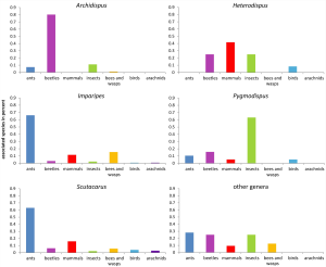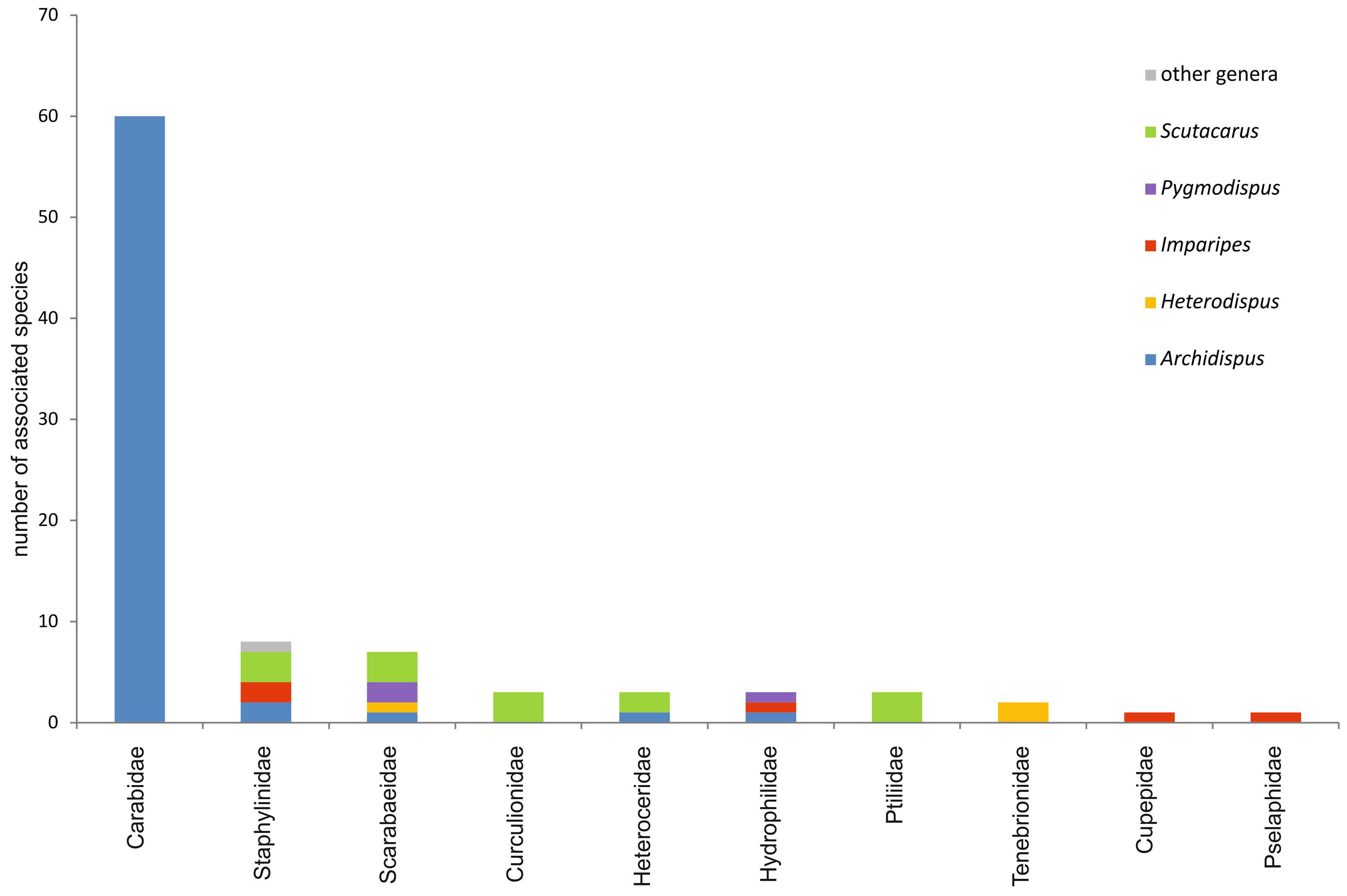 The vast majority of all known Archidispus species (85%) occurs phoretic on beetles, and within this taxon predominately on ground beetles (Carabidae). Less than 10% of the known Archidispus species have been reported in association with other hosts- ants, “insects”, bees and termites. The term “insects” has been adopted from the original literature and indicates that the hosts had not been identified in detail. “Insects” might therefore also include beetles, meanining that the number of Archidispus associated with Coleoptera may even be higher than given here. There are no reports of Archidispus in association with birds or mammals.