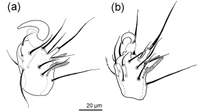 In the genera Archidispus, Lamnacarus and Scutacarus, dimorphic species characterized by the occurrence of phoretic and non-phoretic females exist. This female dimorphism, which is also referred to as phoretomorphism, had firstly been suggested by Norton (1977) for Scutacaropsis baculitarsus agaricus (Norton and Ide, 1974) and had thereafter been demonstrated in other scutacarid species belonging to the genera Archidispus, Lamnacarus and Scutacarus through laboratory cultures by Ebermann (1991a,b). A similar dimorphism in connection with phoresy is also known from other mite taxa, either in deutonymphs or in adult females (Krantz and Walter 2009). To date, 11 scutacarid species are known to be dimorphic (Table 1). The main difference between the two morphs is the size of the claw on the tarsus of leg I, which is large in the phoretic morph and small or even absent in the non-phoretic morph (Figure 2). Moreover, the sclerotisation of phoretic females appears to be stronger (Ebermann 1991a). In the genus Archidispus, there are also distinct differences in the shape of particular setae between the two morphs (Ebermann 1991a,b; Figure 3). The large claws on leg I and the stronger sclerotization can easily be interpreted as adaptations to phoretic behaviour because they allow attachment and also protect the mites during their journey. The possible adaptive value of the differently shaped body setae in the genus Archidispus on the other hand remains unclear.