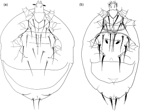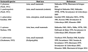 All of the scutacarids associated with mammals except the African H. foveatus and the Mexican I. cupes have been reported from the Holarctic. Unidentified scutacarids have also been reported from mammal carrion (Early and Goff 1986) and scutacarid mites can frequently be found in mammal dung (e.g. Mahunka 1964b, Truck 2012). It would have exceeded the scope of the present review to include all of these dung inhabiting species as, in contrast to scutacarids in bird’s faeces, there is a high number of them and as they cannot be regarded as real associates of mammals.