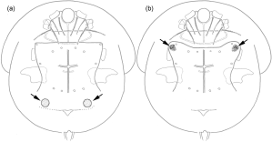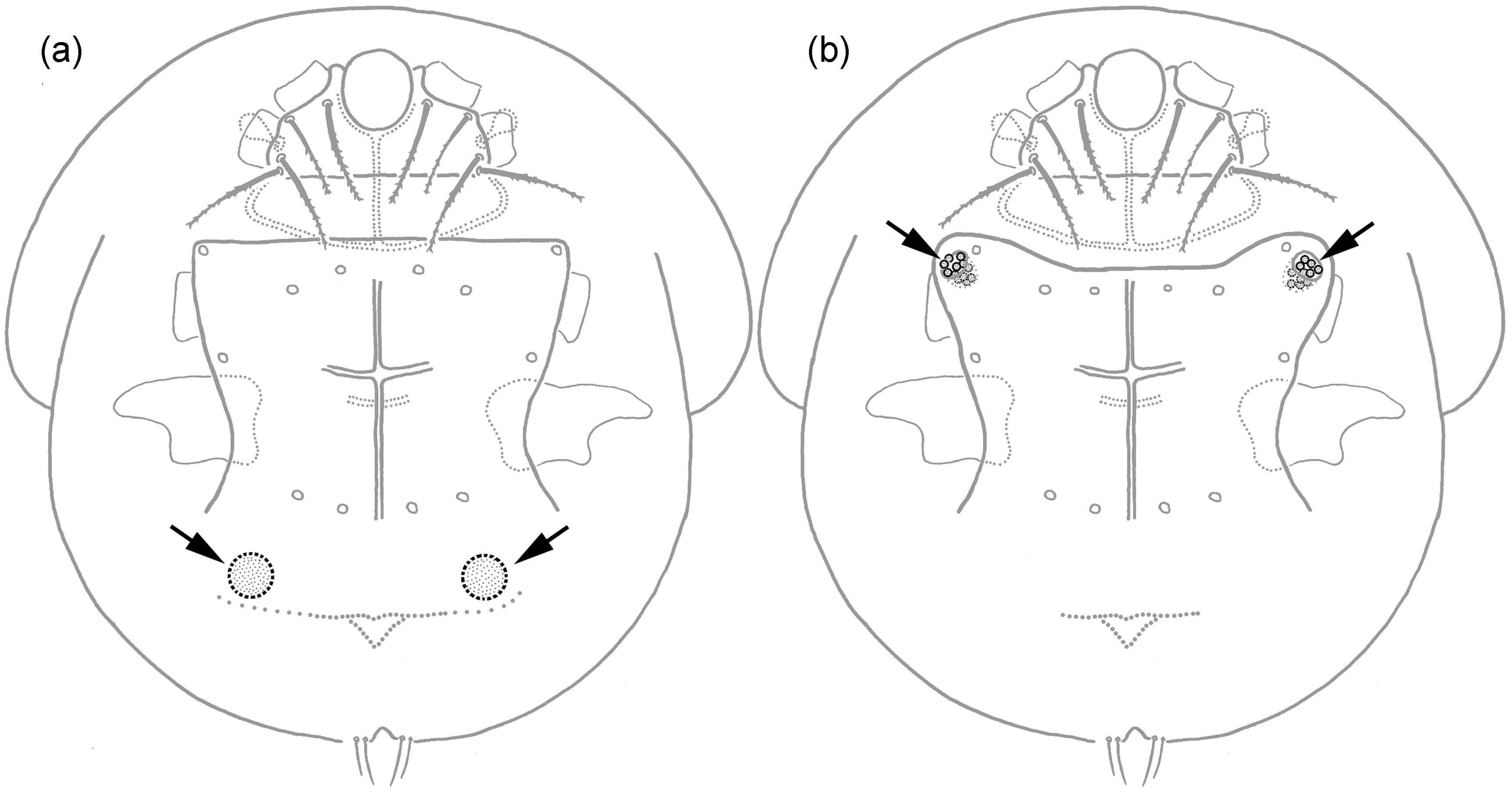 (1) The frequent occurrence of a species on certain hosts tempts to neglect a proper identification. For example, S. acarorum is widely distributed and is also the most common scutacarid associated with bumble bees. Comparisons between presumed S. acarorum individuals from spatially distinct populations (European localities and New York) confirmed their conspecificity even after thorough morphometric analyses (Jagersbacher-Baumann 2015). Because of its abundance, apparently all scutacarids encountered on bumble bees often are being identified as S. acarorum without any closer inspection. However, there are at least three other morphologically similar scutacarid species associated with bumble bees: S. deserticolus, S. mendax and S. occultatus Sevastianov, 1975. They all belong to the acarorum species-complex as they share a very similar phenotype and can also be encountered syntopically in the nests of large bumble bee species (Jagersbacher-Baumann 2014). Re-inspections of presumed S. acarorum individuals thus already revealed incorrect classifications: for example, specimens of “S. acarorum” from Hamburg, Germany, were identified as S. deserticolus (Ebermann 1991a), and “S. acarorum” reported from bumble bees in Argentina turned out to be S. mendax or a new species close to S. mendax (Revainera et al. 2014 and pers. comm.). A not nearer identified scutacarid from Brazilian bumble bees (Guerra et al. 2012) also turned out to be a variation of S. mendax (Baumann unpublished).