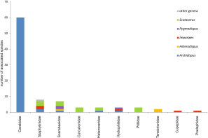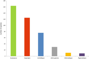 The following chapter will give an overview on (to my knowledge) all reports of associations between scutacarids and other animal taxa published until May 2017. In total, 414 species and subspecies in 17 genera have been reported from some kind of associations with other animals (reports of species listed as “near” or “cf” have been counted as separate species and are thus included in this number). Most species (n = 162) belonged to the genus Scutacarus, followed by Imparipes (125) and Archidispus (76; Figure 5). In the last published comprehensive summary of the taxonomic richness within the order Trombidiformes by Zhang et al. (2011), the family Scutacaridae is indicated to contain about 800 species in 24 genera, so it seems safe to estimate that approximately the half of all scutacarid species live in some kind of association with other animal taxa.