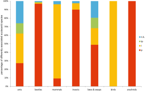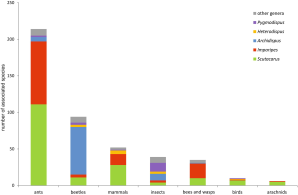 The following subchapters are divided into the reported host taxa, starting with Arachnida, moving to various taxa within the large group of Hexapoda, then to Aves and finally to Mammalia. Due to clarification reasons, the groups of hosts that are used in the graphs do not represent consistent taxonomic taxa, they rather are groups which combine hosts of different taxonomic levels using their common names (e.g., “ants” only describes members of one family while “mammals” covers the members of one whole class).