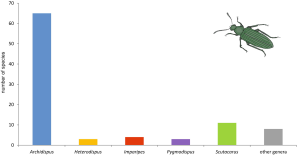 In the taxon Coleoptera, by far the most scutacarid species (62 spp.) can be detected on ground beetles, Carabidae (Figures 8-9; Annex II). All of the mites associated with Carabidae belong to the genus Archidispus, no other scutacarid genera have been found so far (e.g. Karafiat 1959, Kurosa 1977, 1980, 1989, 2005, Khaustov 2008; for other references see Annex II). Moreover, Archidispus can only rarely be seen on beetles belonging to families other than Carabidae. Only two species, A. armatus and A. bembidii, can apart from Carabidae also be encountered on Heteroceridae, Hydrophilidae and Staphylinidae (Karafiat 1959, Mahunka 1972b, Khaustov 2008), and A. irregularis Katlav & Hajinqanbar, 2016 was found only on Staphylinidae. Generally speaking, different scutacarid genera can be found on other beetle families, but among them, the genus Scutacarus is the most prominent (Figure 10).
