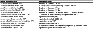 The detection of phoretomorphism had important consequences for scutacarid taxonomy as some taxa, which had been treated as separated species before, had to be merged into one single species. Accordingly, Ebermann (1990) demonstrated that Archidispus soosi (Mahunka, 1967) is the non-phoretic morph of A. armatus (Karafiat, 1959), Lamnacarus coprophilus Mahunka, 1968 is the non-phoretic morph of L. ornatus Balogh & Mahunka, 1963 and Scutacarus subfimetarius Momen & Bagoury, 1989 is the non-phoretic morph of S. longitarsus (Berlese, 1905). In the same work, Ebermann also discouraged from using Variatipes, a subgenus of the genus Scutacarus that is defined by the absence of claws on leg I. This absence of claws could indeed be a “good” character evolved by a gradual reduction of the claws, but specimens without claws could also be non-phoretic morphs of other species.