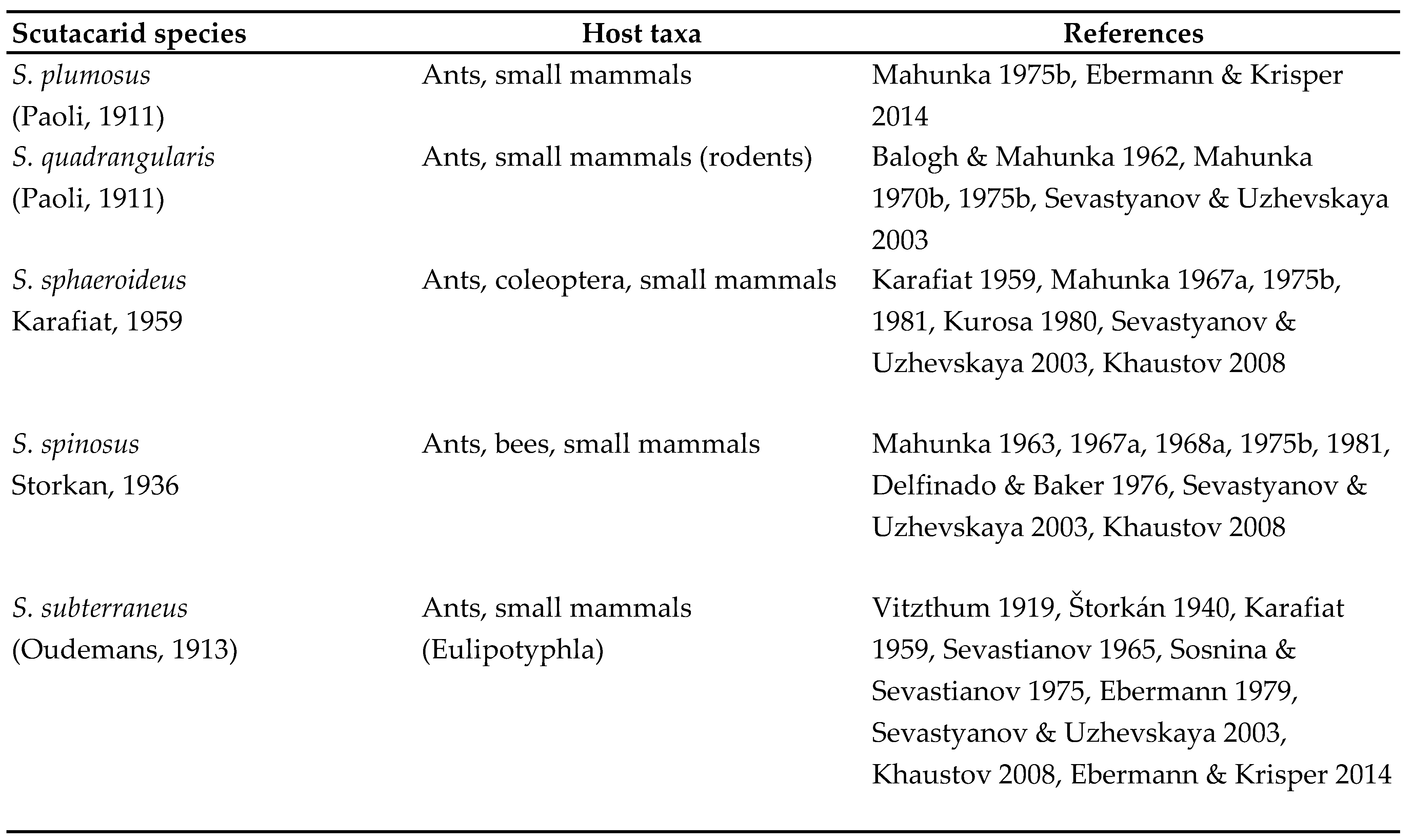 The present work shows that most animal taxa that are accepted as host by scutacarid mites have a strong connection to the habitat “soil”: either they are highly mobile, epigaeic species, or they are endogaeic species building nests in the ground. As Scutacaridae are also soil inhabiting mites, it seems probable that associations between them and their host evolved through the shared habitat. The genus specific trends towards different taxa also indicate that the associations between scutacarids and their hosts evolved independently several times within the family, and most probably also within the genera.