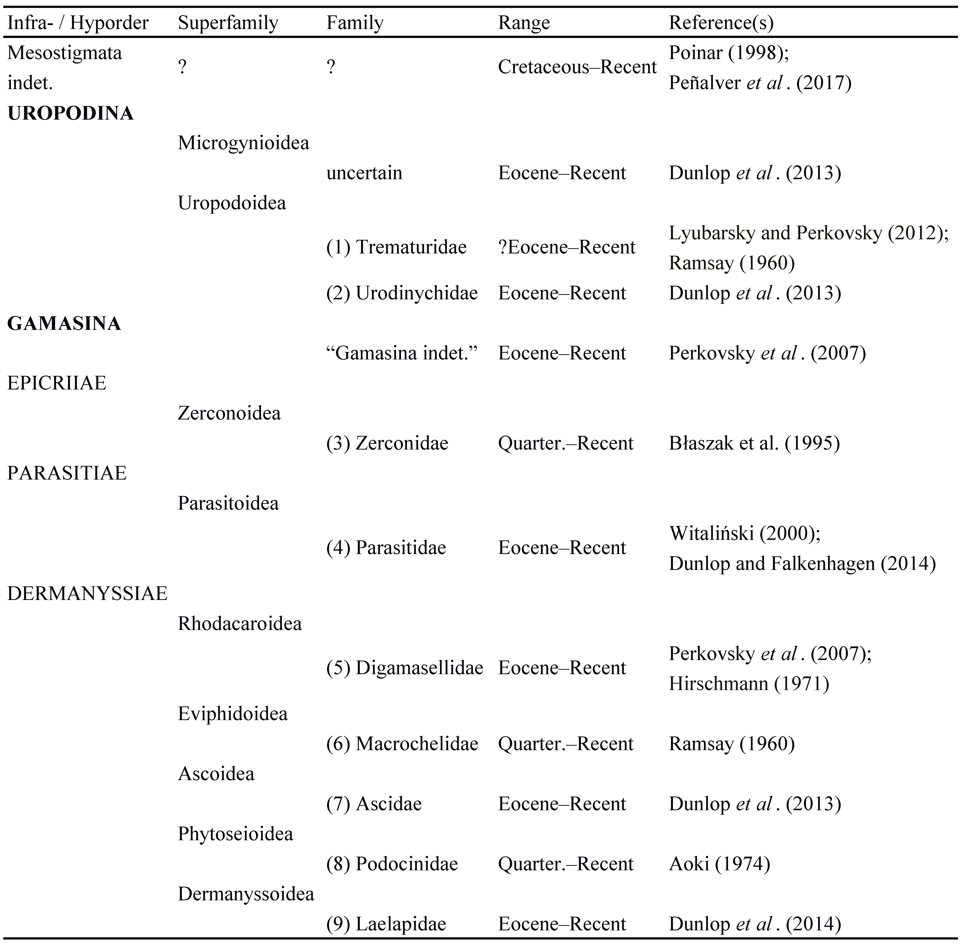 https://doi.org/10.24349/acarologia/20184263Although there are around 11,400 living species of mesostigmatian mites (Acari: Parasitiformes: Mesostigmata) (Beaulieu et al. 2011), this impressive diversity is not reflected in their fossil record. As noted by Dunlop et al. (2014), a possible reason for this is that few mesostigmatan lineages currently inhabit tree bark which, if current ecology reflects ancient ecology, reduced the chance of them becoming preserved as inclusions in amber. Only four fossil species have been formally named: Sejus bdelloides Koch and Berendt, 1854 from Eocene Baltic amber, Dendrolaelaps fossilis Hirschmann, 1971 from Miocene Chiapas (or Mexican) amber, Palaeozercon cavernicolus Błaszak et al., 1995 from a subfossil cave deposit in the USA, and Alecrogamasus stenocornis Witaliński, 2000, again from Baltic amber. In addition to this, there are further examples of fossil mesostigmatans in the literature (see citations in Table 1). Several of them were discovered in association with other arthropods (Lyubarsky and Perkovsky 2012; Dunlop et al. 2013, 2014), but could not be identified beyond the family or genus.
