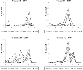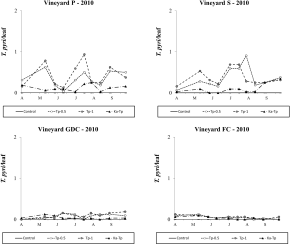Mite seasonal abundance in farm A showed different patterns in the selected vineyards. The most interesting differences concerned spider mite populations in 2009: E. carpini was dominant in vineyards P, S and GDC, while P. ulmi in vineyard FC. Factors affecting the negligible occurrence of E. carpini in vineyard FC compared to vineyards trained with other systems should be investigated. The canopy of free cordon vineyard appeared to be less vigorous (lower number of leaf layers) and irregular (lower percentage of empty spaces) compared with Pergola and Sylvoz systems. Similar patterns were found in vineyard GDC where E. carpini fluctuated at lower density than in the more vigorous P and S vineyards. Little is known on the ecology of E. carpini and the effect of canopy management on this spider mite needs further investigations. On the other hand P. ulmi was more abundant in vineyard FC than elsewhere. One could suggest that P. ulmi populations were allowed to increase in this vineyard because of the relatively low densities of E. carpini in 2009. High E. carpini densities in early season corresponded to relatively low P. ulmi populations in summer and vice versa (Duso and Pasqualetto, 1993). This topic also requires additional investigations.