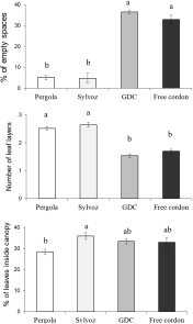 The analysis of canopy structure showed significant differences among vineyards in certain parameters. Vineyards P and S had a lower incidence of empty spaces than vineyards GDC and FC (F 3, 164 = 98.78; P<0.001; Figure 10). The number of leaf layers was higher in canopies of vineyards P and S than in those of GDC and FC (F 3, 164 = 76.28; P<0.001; Figure 10). The proportion of leaves inside the canopy was higher in vineyard P than in vineyard S, while vineyards GDC and FC gave intermediate results (F 3, 164 = 3.72; P=0.013; Figure 10).