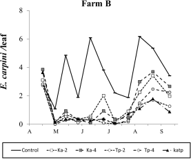 In farm B Ph. finitimus populations occurred at higher densities in early spring, decreased in summer but re-established moderate levels in late season. Trials with Ph. finitimus suggest that this species suffered less from interspecific competition than A. andersoni. Long term studies are required to understand the outcome of interspecific interactions involving this species (Duso and Vettorazzo, 1999). The role of EBDCs in affecting competition should be investigated more in depth.
