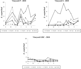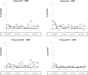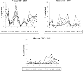 During the 2009 season, E. carpini populations fluctuated at relatively high (i.e., more than 1 motile form per leaf as seasonal average; Figure 2) densities in P and S vineyards, moderate densities in GDC (i.e., 0.5 – 1 motile forms per leaf as seasonal average; Figure 2), and negligible levels in FC vineyard (i.e., less than 0.01 motile form per leaf as seasonal average; data not shown). The effect of treatment was not significant in vineyard P (F 2, 52=1.16; P=0.339; Figure 2) nor in vineyard S (F 5, 36.6=0.92; P=0.482; Figure 2). In contrast, it was significant in GDC vineyard (F 5, 58=2.68; P=0.030; Figure 2) where T. pyri releases significantly reduced E. carpini numbers, independently on release density (F 1, 58=9.51; P=0.003), in contrast with K. aberrans releases (F 1, 58=2.28; P=0.136). Only the lowest release densities of K. aberrans affected E. carpini densities (F 1, 58=4.24; P=0.044). There were no differences in the abundance of spider mites between release plots of the two predatory mites (F 1, 58=3.72; P=0.087). Eotetranychus carpini densities were significantly reduced in Ka-Tp treatment compared to the control (F 1, 58=4.79; P=0.033; Figure 2). The remaining comparisons were not significant.