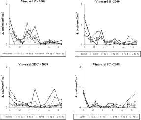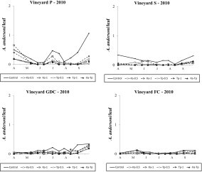 Native predatory mite colonization patterns appeared also different in the four vineyards of farm A. In vineyards P and S, A. andersoni appeared to be more abundant than in the remaining vineyards. Differences may be due to higher E. carpini populations in these vineyards but also to their canopy features.