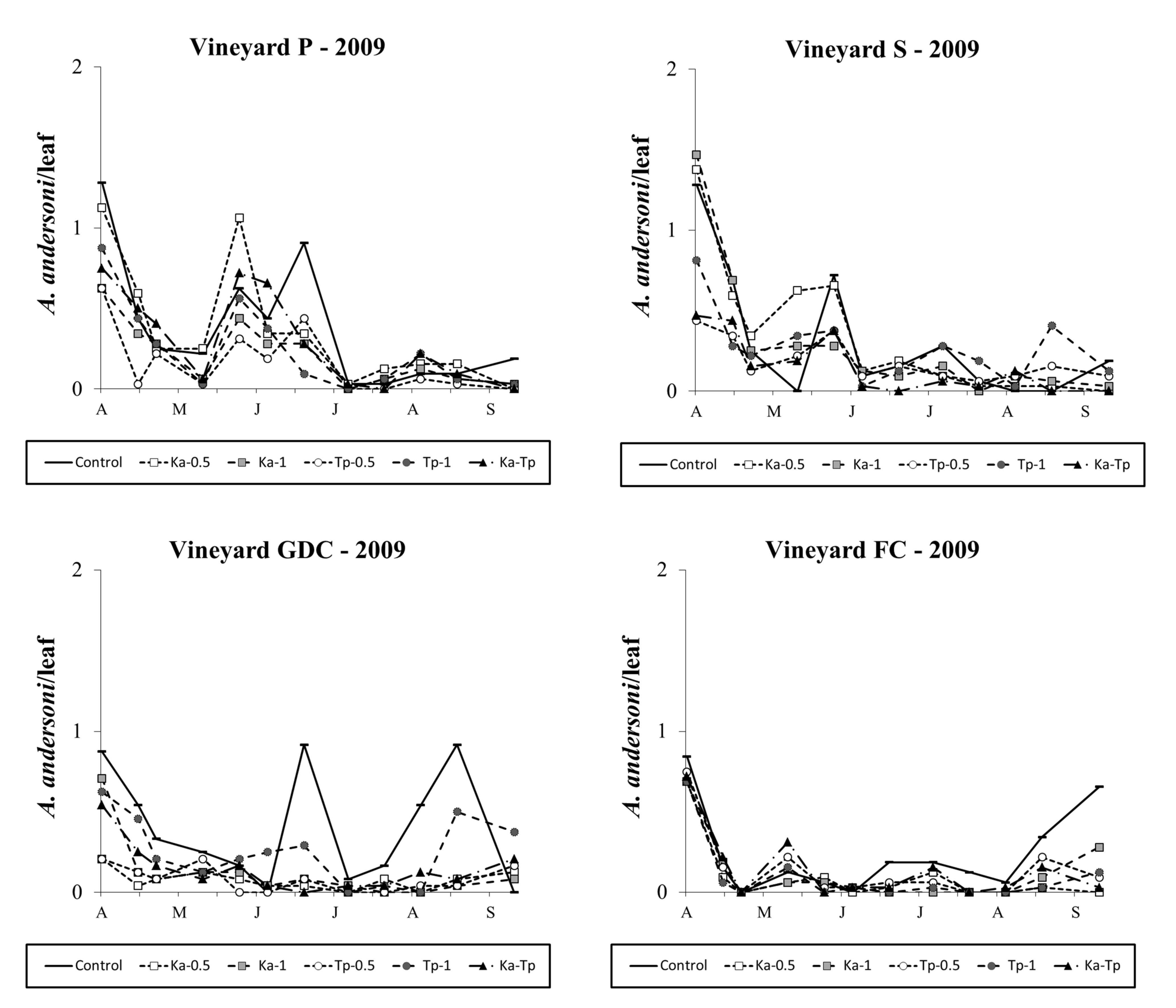In 2010, A. andersoni populations appeared to be less abundant than in 2009. The effect of treatment was significant in all vineyards (vineyard P: F 5, 37.5=11.82; P<0.001; vineyard S: F 5, 35.4=8.96; P<0.001; vineyard GDC: F 5, 49.9=5.75; P<0.001; vineyard FC: F 5, 61.9=5.61; P<0.001; Figure 5). Amblyseius andersoni densities were reduced in K. aberrans (vineyard P: F 1, 37.5=45.31; P<0.001; vineyard S: F 1, 35.4=39.73; P<0.001; vineyard GDC: F 1, 49.9=21.28; P<0.001; vineyard FC: F 1, 61.9=22.37; P<0.001) as well as in T. pyri treatments (vineyard P: F 1, 37.5=50.23; P<0.001; vineyard S: F 1, 35.4=32.89; P<0.001; vineyard GDC: F 1, 49.9=13.95; P<0.001; vineyard FC: F 1, 61.9=13.14; P<0.001). There were no differences between the released species (vineyard P: F 1, 37.5=0.190; P=0.665; vineyard S: F 1, 35.4=0.48; P=0.491; vineyard GDC: F 1, 49.9=1.29; P=0.626; vineyard FC: F 1, 61.9=2.27; P=0.137) or the density of release (vineyard P: F 1, 37.5=0.01; P=0.912; vineyard S: F 1, 35.4=0.04; P=0.834; vineyard GDC: F 1, 49.9=0.09; P=0.766; vineyard FC: F 1, 61.9=0.74; P=0.392; Figure 5).