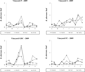 Typhlodromus pyri releases appeared to be successful but its densities were always lower than 1 motile form per leaf in 2009. The effect of treatment was significant in all vineyards (vineyard P: F 3,48.5=22.99; P<0.001; vineyard S: F 3, 25=3.96; P=0.019; vineyard GDC: F 3, 33.6=18.59; P<0.001; vineyard FC: F 3, 30.4=6.78; P=0.001; Figure 8) and there were more T. pyri in the respective release plots than in the control (vineyard P: F 1,48.5=43.79; P<0.001; vineyard S: F 1, 25=4.51; P=0.044; vineyard GDC: F 1, 33.6=33.49; P<0.001; vineyard FC: F 1, 38.8=18.18; P=0.001). In vineyards P and GDC the presence of K. aberrans affected T. pyri densities where the two species were released in the same plots (F 1, 48.5=10.11; P=0.003; F 1, 33.6=12.14; P=0.001; Figure 8) but this phenomenon did not occur in vineyards S (F 1, 25=2.52; P=0.125; Figure 8) and FC (F 1, 38.8=0.01; P=0.988; Figure 8).