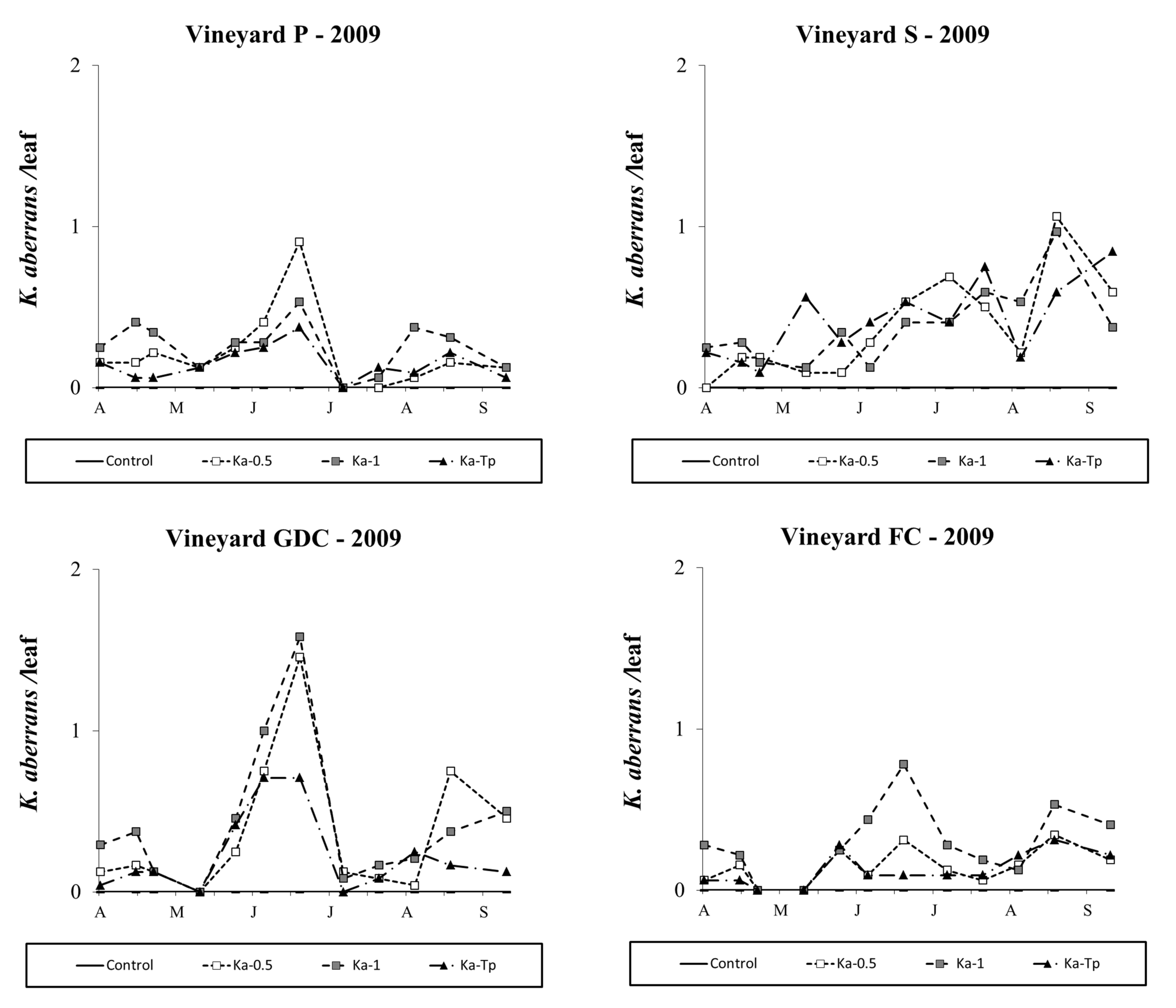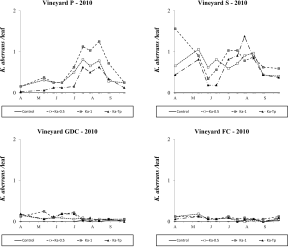 Kampimodromus aberrans populations successfully established after releases, even if predatory mite numbers did not reach high levels. In 2009, the effect of treatment was significant in all vineyards (vineyard P: F 3,46=18.85; P<0.001; vineyard S: F 3, 35.8=22.69; P<0.001; vineyard GDC: F 3, 37.5=33.89; P<0.001; vineyard FC: F 3, 38.8=18.70; P<0.001; Figure 6) and there were more K. aberrans in the respective release plots than in the control (vineyard P: F 1,46=47.62; P<0.001; vineyard S: F 1, 35.8=66.93; P<0.001; vineyard GDC: F 1, 37.5=86.55; P<0.001; vineyard FC: F 1, 38.8=35.72; P<0.001). In Ka-Tp treatments the presence of T. pyri affected K. aberrans densities in vineyards GDC and FC: (respectively: F 1, 37.5=4.32; P=0.044; F 1, 38.8=12.91; P<0.001; Figure 6) but not in vineyards P and S (respectively: F 1,46=2.02; P=0.162; F 1, 35.8=0.01; P=0.988; Figure 6).