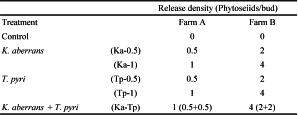 In January, before releases, 40 two-year old branches were collected from each farm and brought to the laboratory. Here the branches were analyzed as described above, and the identity and density of overwintered phytoseiids were recorded. Densities of 7.21 K. aberrans females per internode and of 11.34 T. pyri females per internode were calculated. These figures were considered in order to assess the number of predatory mites to be released per bud.