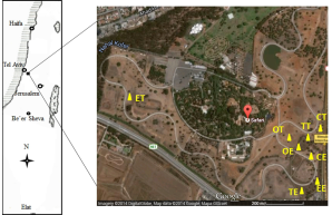 The field experiment was set up at the Safari Zoological Center (E 34.82’, N 32.04’; elevation 80 m above sea level) in Ramat-Gan, Israel (Fig. 1). The center was founded in 1974 in the format of an African safari, occupying 250 acres of nature in the heart of a densely populated urban area (http://www.safari.co.il/). The region has a typical Mediterranean climate, characterized by a short, cool, wet winter and a long, hot, dry summer, with a dry-out transition season in spring. The mean annual rainfall is 500 mm, and the mean annual temperature is 14 °C, with a maximum of 30 °C in summer and a minimum of 7 °C in winter (data from the Israel Meteorological Service). The soil types belong to the Grumsols and are dark, dull-colored clay soil according to the local Israeli classification system. The electrical conductivity is 0.73 mmho cm-1, and the texture is sandy clay soil with 46.8%, 12.4%, and 40.7% of clay, silt, and sand, respectively. The CaCO3 content is 88.7%, and according to SSA (Soil Science of America – standards), the calcium carbonate content is 234 m2 g-1 (Dan and Koyumdjiski, 1979).