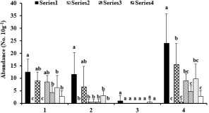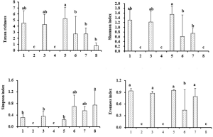Soil microarthropod abundance was expressed as the number of individuals per 10 grams dry weight of substrate. In addition, the soil Acari diversity indices, including taxonomic richness (number of taxa), Shannon index, Simpson index, and evenness index were calculated based on the abundance of Acari families.