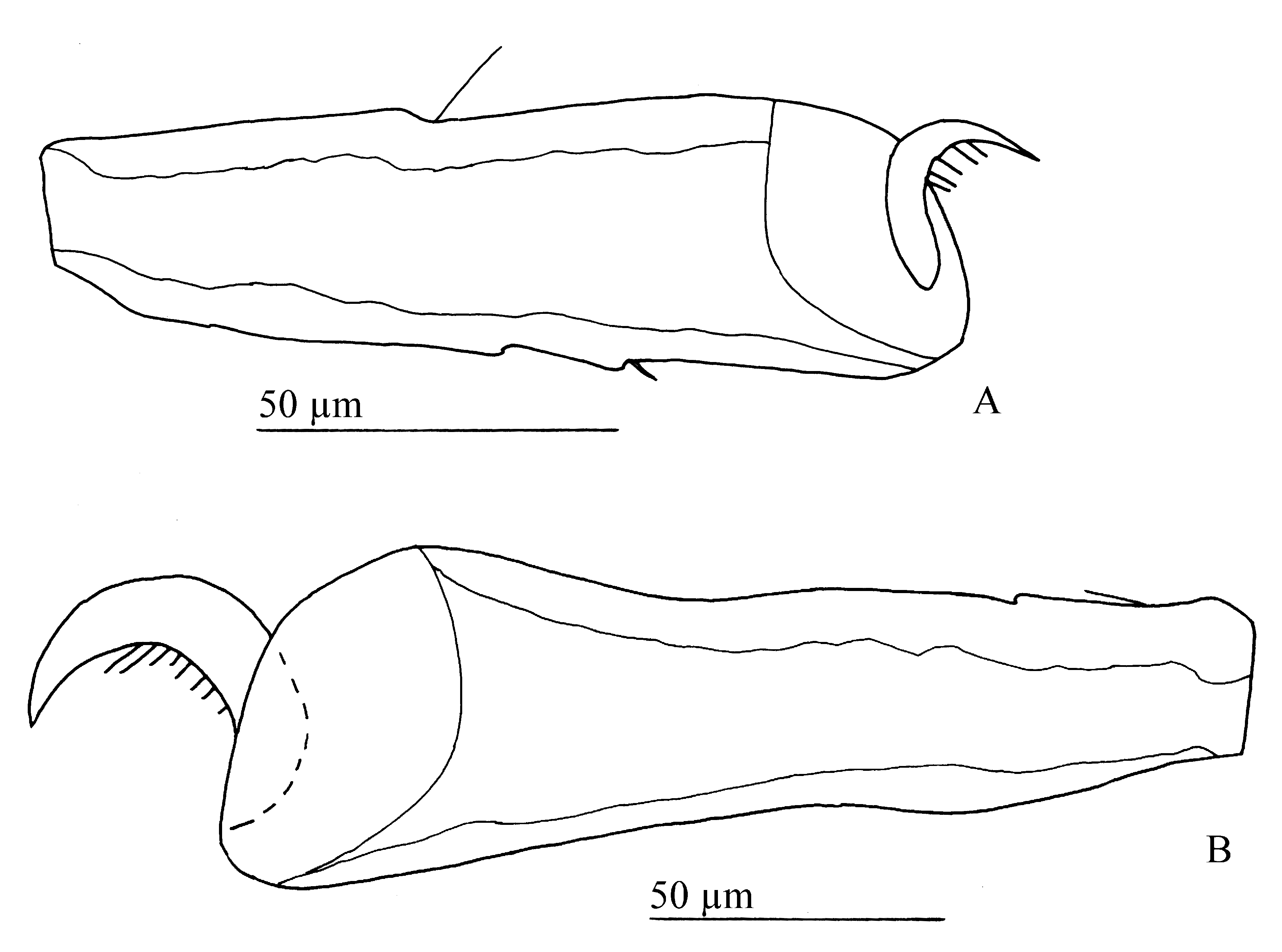 In all three Mamersonia types mentioned above the claw of the third leg is distinctly larger than the claws of the first and second leg (Figs.1A-B). On my request Gunvi Lindberg (Swedish Museum of Natural History, Stockholm) send me some pictures of the claws of the types of Mamersellides ventriperforatus. Also, in the holotype female and paratype male the claw of the third leg is larger. This characteristic is not mentioned by Lundblad (1941) nor by Rosso de Ferradás (1973). The latter author illustrated al three legs, but the claws of the legs are all similar. Lundblad (1941) illustrated the claw of the third leg correctly, but as mentioned before, without giving the differences with the claws of the first and second leg.