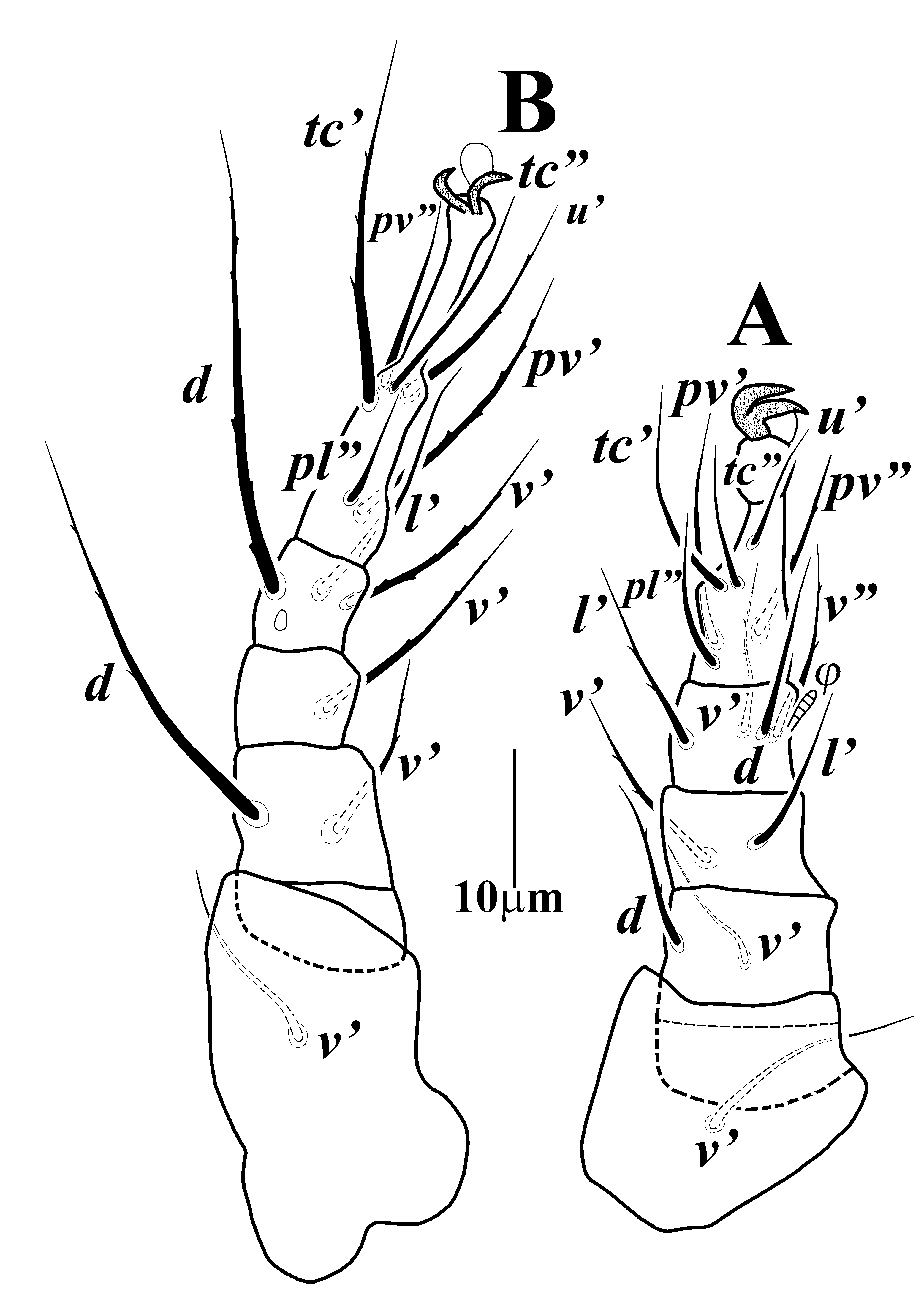 Legs (Figs 2, 3) – Leg I (Fig. 2A). Thinner and shorter than other legs. Setal formula: (number of solenidia in parentheses): Tr1–Fe3–Ge4–TiTa15 (4). Tibiotarsus I with seta k and five other blunt-ended eupathidial setae (p'', tc', tc'', ft' and ft''), solenidion ω1 6 (6–7) digitiform, solenidion ω2 3 (3–3) baculiform, solenidion φ1 3 (2–3) weakly clavate, φ2 3 (2–3) baculiform, setae pl' and pl'' whip-like; genu with three barbed setae and seta l'' smooth; femur with setae d, v'' and l' subequal. Leg II (Fig. 1B). Setal formula: Tr1–Fe3–Ge3–Ti4(1)–Ta6(1). Tarsus with sickle-like simple claws, solenidion ω 4 (3–4) digitiform, seta pl'' shortest on tarsus I; tibia with solenidion φ 3 (2–3) weakly clavate, setae v' and v'' subequal and longer than two others; genu with setae l' thickened; femur with setae l' and d, shortest and longest setae on legII, respectively; trochanter with seta v' as long as v' on first leg. Leg III (Fig. 3A). Setal formula: Tr1–Fe2–Ge2– Ti4(1)–Ta6. All leg setae smooth and pointed; tibia with solenidion φ 3 (2–3) digitiform, seta l' shorter than three others; genu with two subequal setae l' and v'; femur divided into basi- and telofemur with seta d longer than seta v'; trochanter with seta v' longer than femoral seta v'. Leg IV (Fig. 3B). Setal formula: Tr1–Fe2–Ge1– Ti4(1)–Ta6. Setae tc' thickened; tibia with solenidion φ 3 (2–3) digitiform, seta v'' on tibia and tc' on tarsus are shortest and longest on leg IV, respectively; genu with seta v' as long as seta v'' on tibia; femur divided into basi- and telofemur with seta v' longer than d; trochanter with seta v' longer than v' on femur.