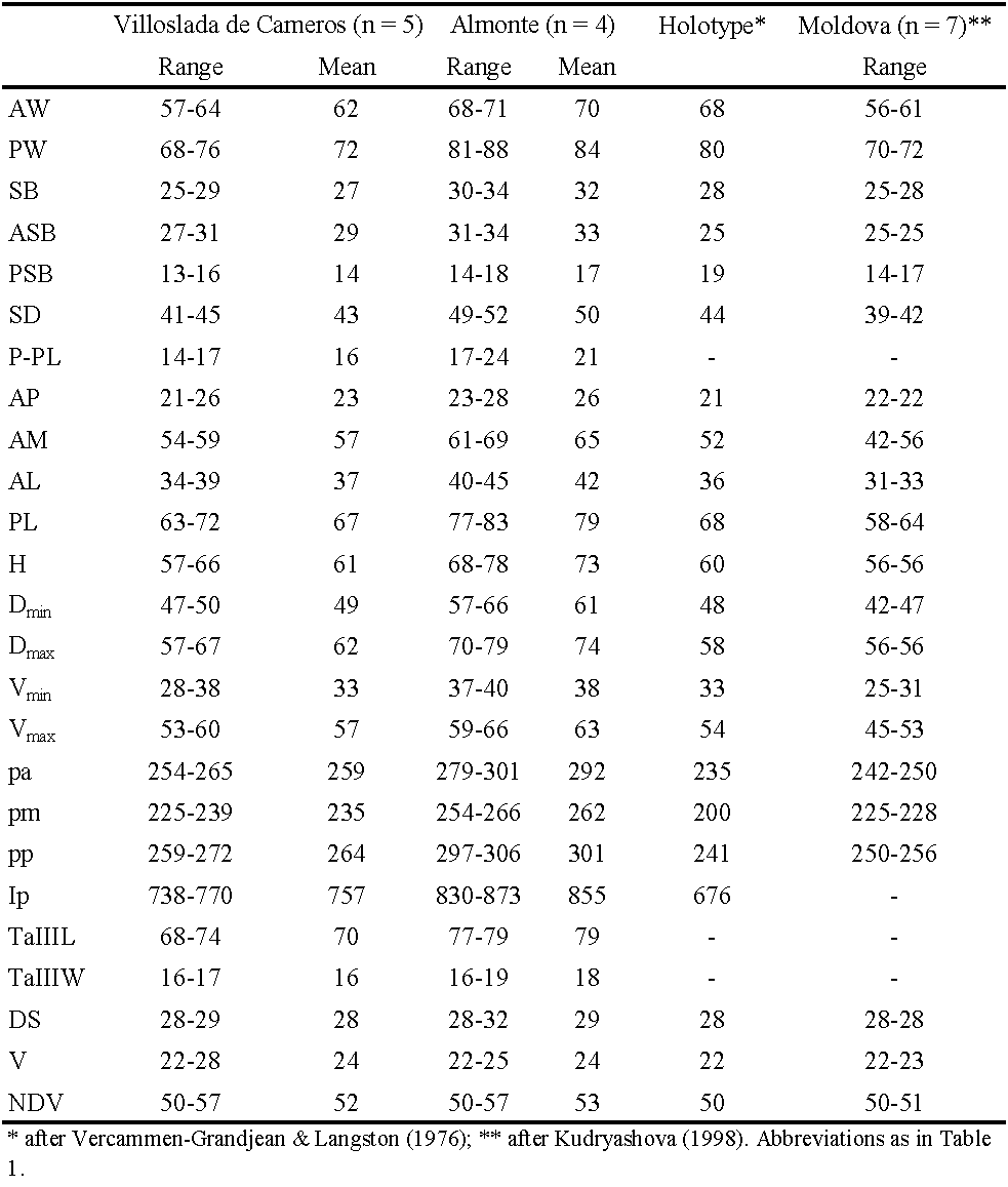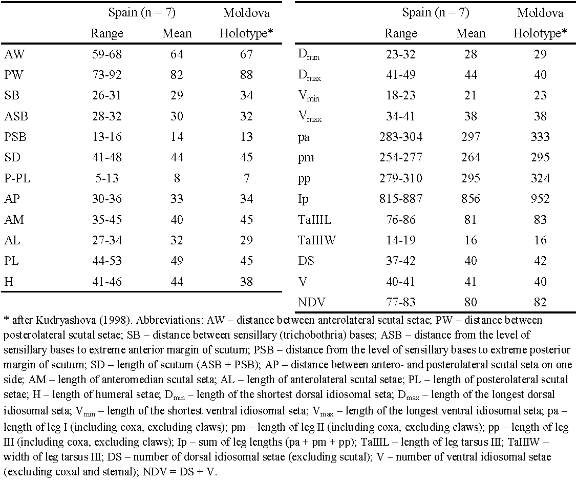 The metric characters of specimens collected from Villoslada de Cameros are very close to the typical L. russicum. However, the specimens collected in Almonte are significantly larger (Table 2). Seven of the nine specimens examined had the arrangement of dorsal idiosomal setae characteristic for L. russicum (fD = 2H-8-6-6-4-2); one specimen from Villoslada de Cameros had 2H-8-7-6-4-2 and one specimen from Almonte had 2H-10-6-7-4-3. Only one specimen from Villoslada de Cameros and one from Almonte had the numbers of all idiosomal setae characteristic for L. russicum according to Vercammen-Grandjean & Langston (1976) and Kudryashova (1998) (DS = 28, V = 22, and NDV = 50). Other specimens have V = 23 – 28 and NDV = 51 – 57.