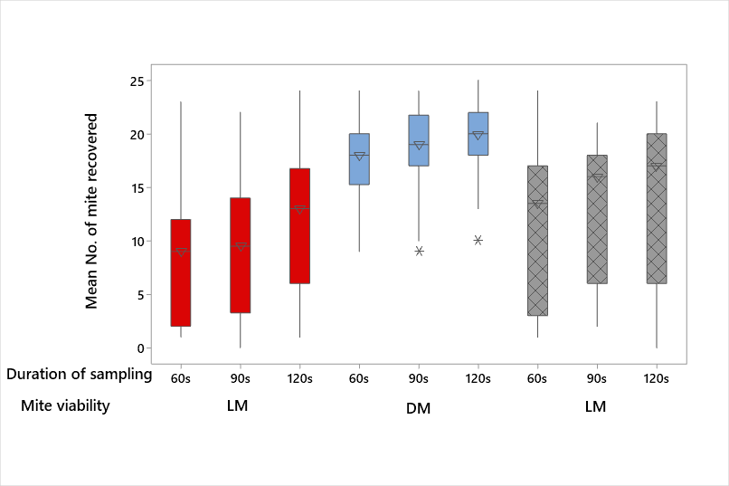 Basic descriptive statistics were calculated using Minitab 19 statistical software (2019). The General Linear Model (GLM) is an ANOVA procedure performing a least squares regression approach to describe statistical correlations. Here the GLM analysis was used to test the effect of several factors by using a coding scheme for time, protocols, fabric and viability of mites. The response variable was the number of mites recovered. The input variables were mite viability: live (LM), dead (DM) and euthanized (EM), sampling protocol used (P1 and P2), fabric type (cotton, denim and fleece) and duration of sampling (60 seconds, 90 seconds and 120 seconds). The GLM model requires normally-distributed data, therefore all data (number of mites recovered was transformed first to root squared values). A one-way ANOVA test was also carried out to compare the three different sampling times in each time category as well as comparing the same sampling times between the three different fabrics. Each one-way ANOVA test was followed by a Tukey post-hoc test to determine whether there were significant differences between the groups tested.