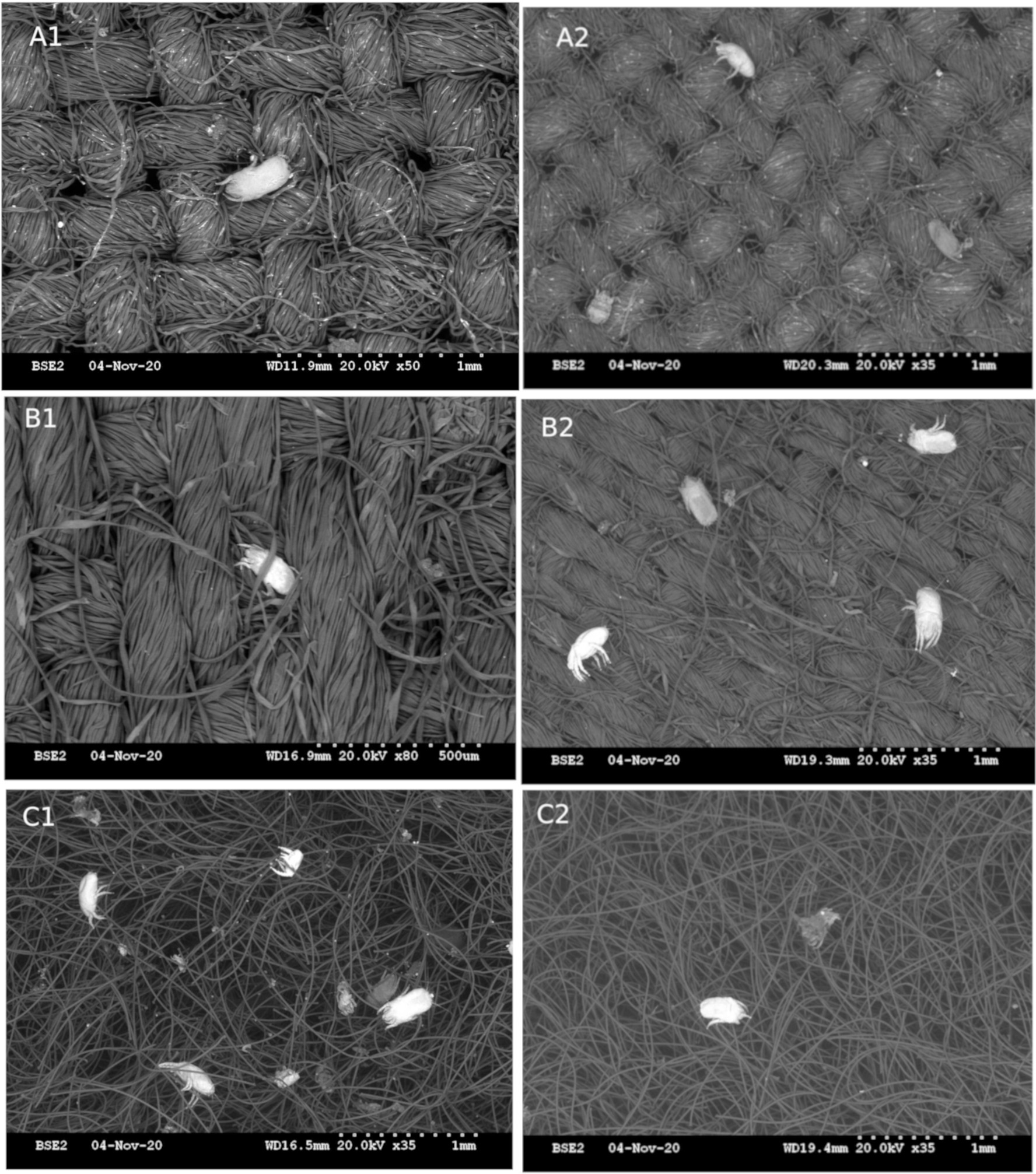 Figure 5 shows the weave structures of fabrics used in this study. Cotton (A) and denim (B) are both tightly woven fabrics making them structurally similar while fleece (C) is a non-woven fabric consisting of a deep pile (3- 4mm) of polyester material. Dead mites generally remained on the surfaces of textiles while live mites frequently showed evidence of burrowing into the fabric (Figure 6).