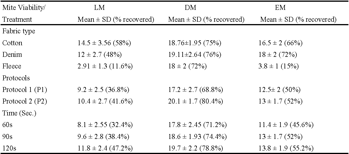 Live mites (LM) were seeded onto fabrics and petroleum jelly (derived from cotton tree) was applied to the perimeter of the fabrics to prevent mite escape in accordance with protocols described by others (Reddy and Bautista, 2012). The fabrics were vacuumed after 10 minutes post seeding of mites. This facilitated the recovery of live mites from the surface of fabrics and from within the fabric weave (after mites burrowed/were entrapped within the fabric weave).