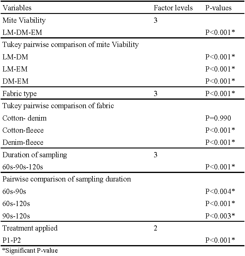 The GLM was used to determine the statistical effect of every possible combination of the experimental treatments on the response variable i.e. number of mites recovered (Table 3). All treatments (mite viability, fabric type, protocol applied and duration of sampling) had a significant effect on the response variable. Furthermore, Tukey pairwise comparisons indicated significant differences in mite recovery between the mite categories (LM, DM and EM). While no significant difference in mite recovery was detected between cotton and denim, there were significant differences between fleece and denim/cotton. Furthermore, as presented in Table 3, there were significant effects on the mean number of mites recovered from fabrics between all sampling durations (60 seconds, 90 seconds and 120 seconds).
