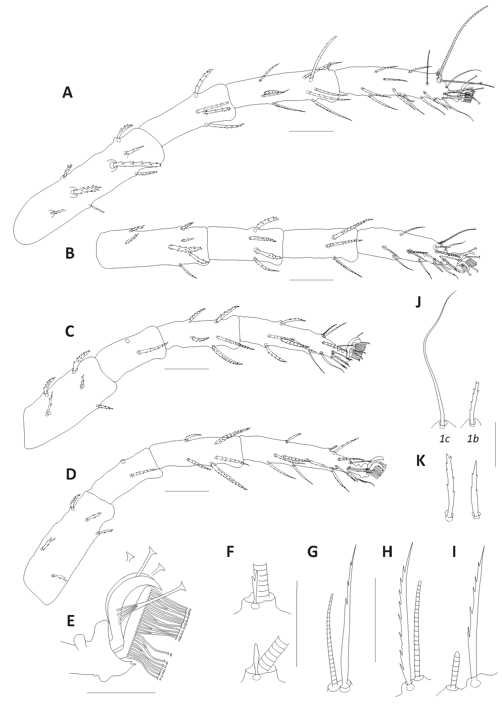 True claws uncinate, with one pair of tenent hairs, empodial pads I–IV similar with two rows of ventrally directed tenent hairs (Fig. 10E). Largest serrated seta l″ present on femur I 32 (24–31). Proximal coxisternal seta 1b slender, smooth 45 (41–56), distal coxisternal seta 1c shorter 12 (12–16), serrate, stout, sometimes acute distally (Fig. 10J–K). Fastigial setae (ft′, ft″) of duplex setae on tarsi I and II not elongate slender, stouter, sometimes serrate or furcate (Fig. 10F). On legs II–IV, tectals (tc′, tc″) and unguinals (u′, u″) divided distally, furcate distally on leg IV. Tarsus III associated setae serrate and approximate with solenidion forming duplex, tactile member longer, proximal or distal in holotype, proximal in paratypes, solenidion about ¾ the length of tactile (Fig. 10G–H); tarsus IV with solenidion well-separated from tactile, proximal, about 1/3 to 1/4 the length of tactile (Fig. 10I).