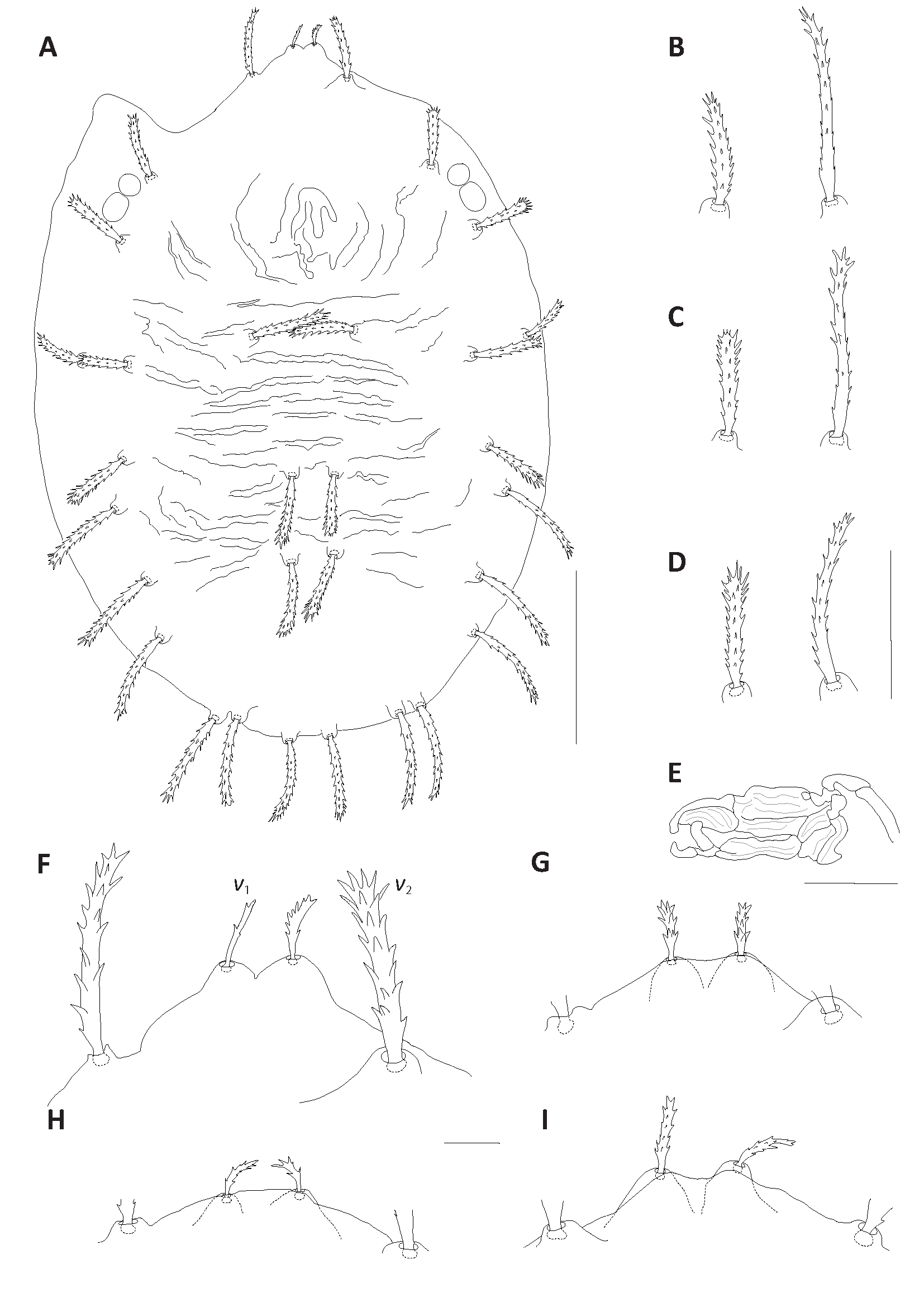 Dorsum – Prodorsal lobes well developed, outer propodosomal lobes more or less triangularly shaped, inner lobes conical, 35–40 high, well separated by an incision 19–23 in depth varying from ''V'' to ''U'' shaped, with fused base slightly more than half their length. Incision between median and outer lobes wider, bottom rounded, moderately deep (Fig. 6A, E). Propodosomal setae v2 of outer lobes reach the middle of setae v1 or 2/3 of setae v1 of inner lobes, v2 about 1.5 times the length of v1. Dorsal setae inserted on tubercles (except setae v1 and v2), stronger on hysterosoma and posteriorly. Prodorsal setae serrate, subspatulate except v1 almost subspatulate. Hysterosomal setae serrate, setae c1 to d2 and e1 subspatulate, enlarged distally, setae d3 elongate slightly enlarged, setae e2 to h1 elongate, slender (Fig. 6A–D). Dorsocentral setae c1 and d1 more than twice shorter than distances between consecutive setae, setae v1 and sc1 the shortest, e2, e3, f1 and f2 the longest: v1 25–30; v2 39–45; sc1 22–29; sc2 32–36; c1 36–41; c2 34–41; c3 31–34; d1 34–39; d2 46–56; d3 35–60; e1 46–50; e2 62–69; e3 65–73; f1 64–70; f2 63–72; h1 57–64. Distances between setae: c1–c1 81–90, d1–d1 57–61, e1–e1 40–44, c1–d1 91–103, d1–e1 79–83, v1–v1 24–26, v2–v2 85–93. Setae f1 in lateral position not contiguous to f2. Shoulders absent on prodorsal margins.