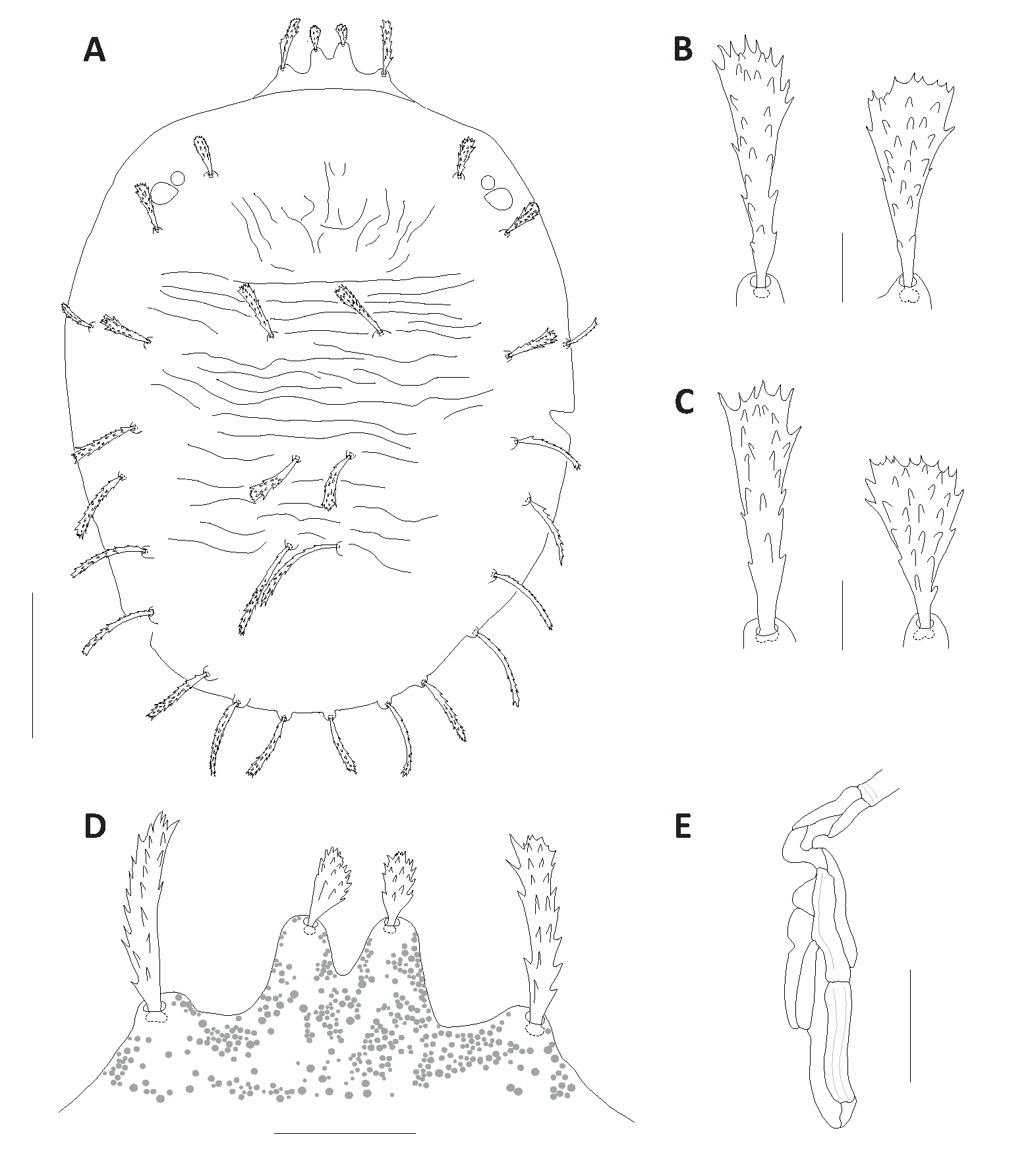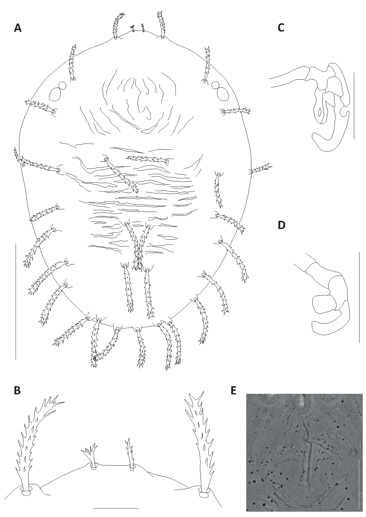 Dorsum – Outer prodorsal lobes reduced to tubercles, inner absent, prodorsal setae v1 short serrate elongate sometimes furcate, v2 larger about 3.5 to 5 times the length of v1, elongate and serrate (Fig. 14A–B). Medial prodorsal striation as in Fig. 14E. Dorsohysterosomal body setae serrate, elongate, slender inserted on tubercles, c3 the shortest, e1-3 the longest. Setae c1 shorter than distances between insertions of members of c1 setae and shorter than between consecutive setae. Setae d1 surpass e1 setal insertions, setae f1 and f2 marginal, contiguous. Lengths of dorsal setae: v1 6–8; v2 24–33; sc1 27–40; sc2 25–39 ; c1 35–49; c2 30–41; c3 19–26; d1 36–57; d2 27–49; d3 37–50; e1 42–60; e2 41–59; e3 41–61; f1 40–55; f2 35–50; h1 31–46. Distances between setae: c1–c1 54–66, d1–d1 17–24, e1–e1 18–27, c1–d1 48–60, d1–e1 34–48. Ratio c1 / c1–c1 0.65–0.86, ratio c1 / c1–d1 0.72–0.84, ratio d1 / d1–e1 0.98–1.4, ratio d1–d1 / e1–e1 0.7–1.15. Dorsohysterosomal setae length may vary between specimens, setal shape does not.