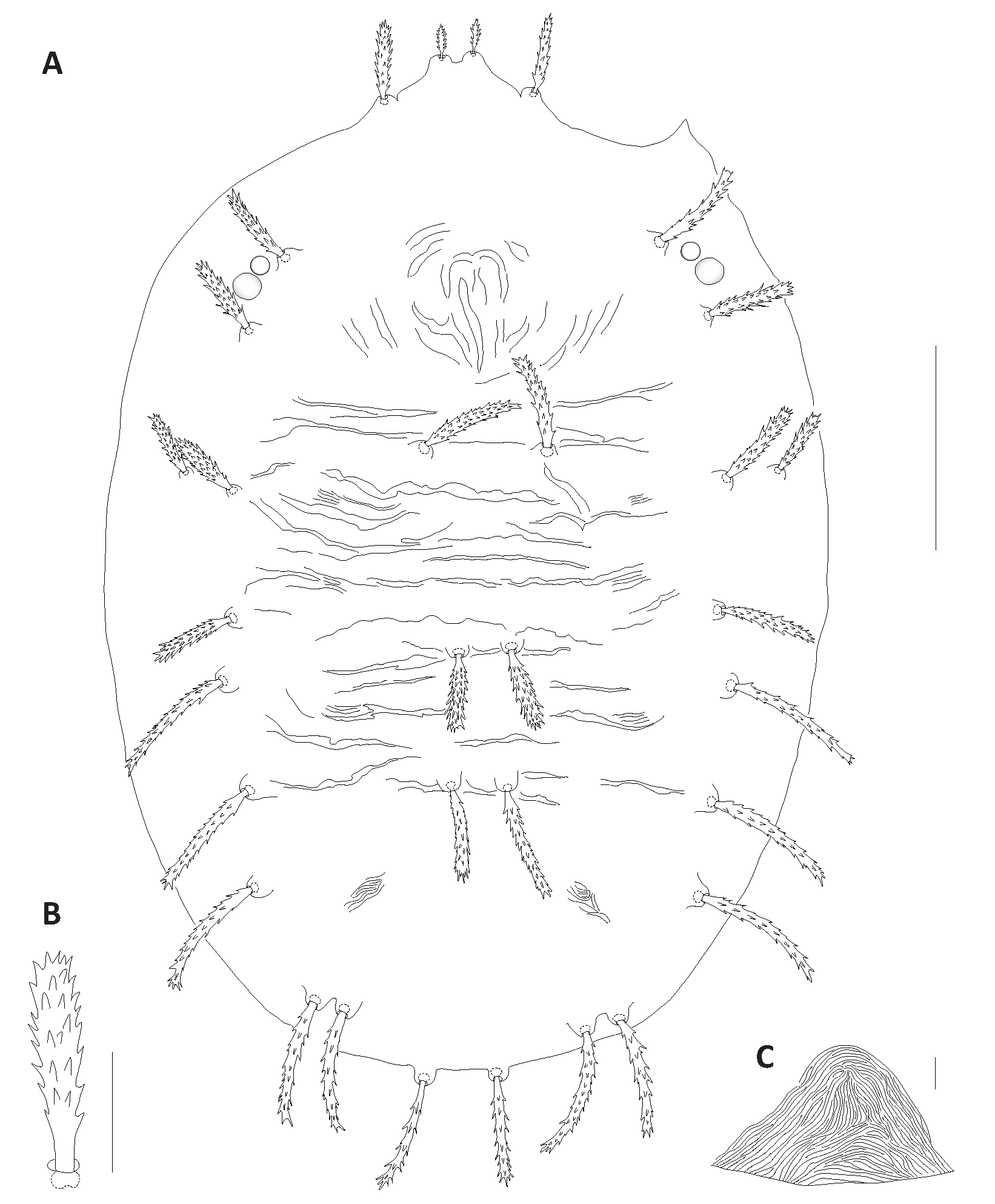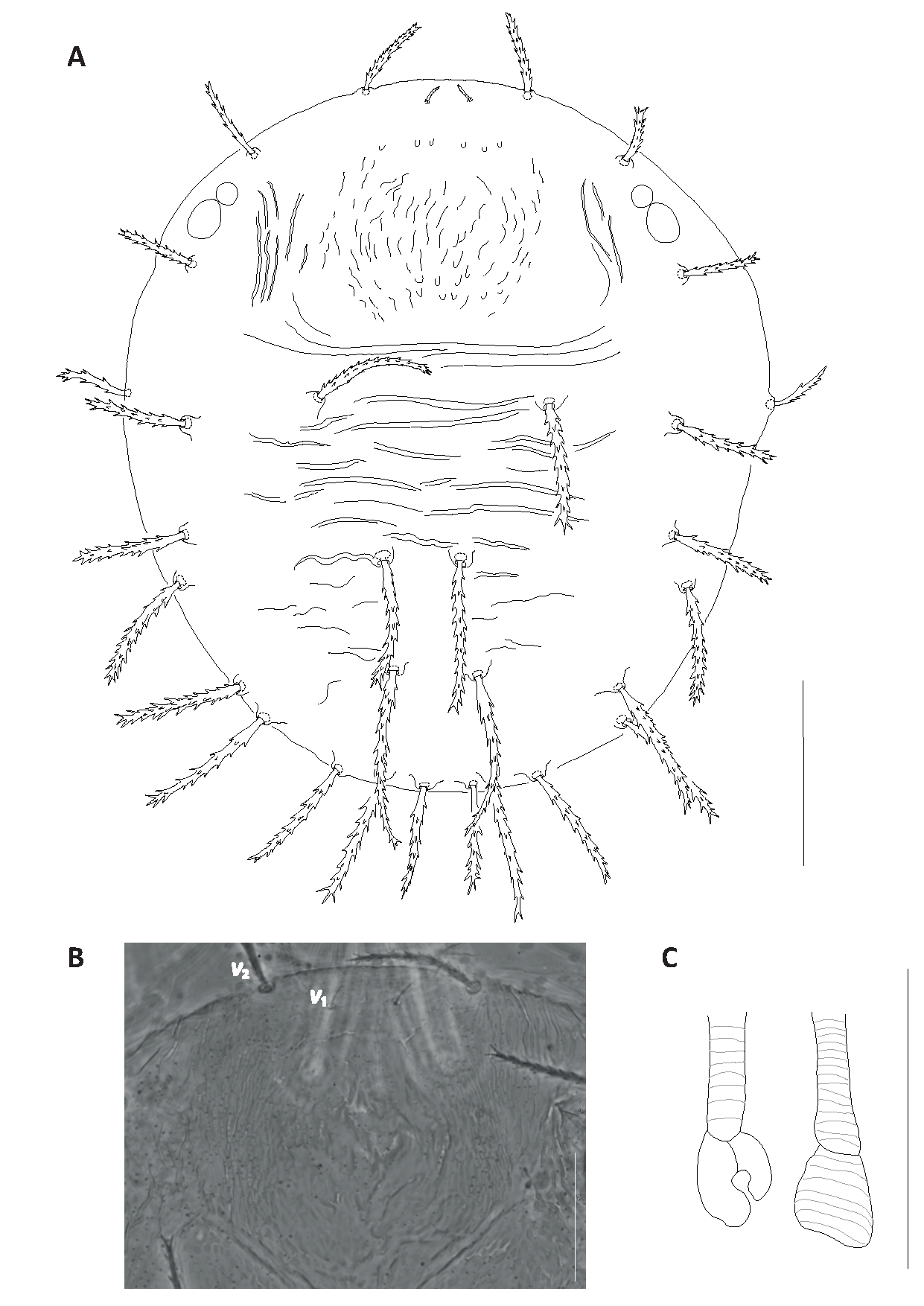 Dorsum – Dorsal body setae long, linear lanceolate, well surpassing in length distance between consecutive bases: v2 56 (55–58); sc1 89 (90–98); sc2 63 (60–67); c1 78 (76–81); c2 79 (79–88); c3 72 (65–75); d1 79 (76–87); d2 78 (76–84); e1 68 (67–86); e2 76 (78–81); f1 61 (57–62); f2 57 (54–61); h2 23 (21–25). Dorsal striation without lobes.