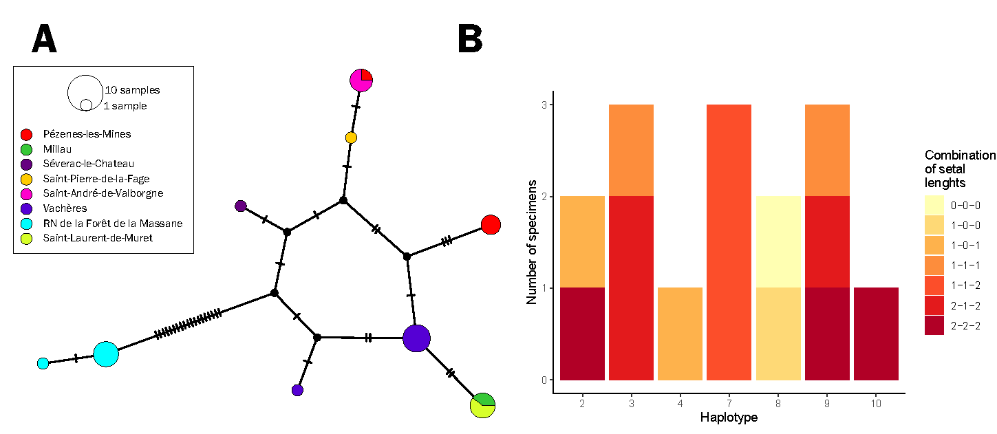 The final alignment of the 30 sequences of B. (P.) polymorpha sp. nov. comprised 873 nucleotide positions out of 31 were variables and revealed 10 haplotypes (Tables 1 and 2). The maximum distance obtained was 3.06% a value close to previous intraspecific studies (Gotoh et al., 2009, Boubou et al., 2011). The TCS haplotype network presented highlighted the presence of two clades confirmed by a neighbour-joining tree (not shown). One clade was grouping all the specimens from all the localities sampled except the Massane Nature Reserve ones which were separated by 21 mutational steps from the closest specimens from Séverac-le-Château and Vachères (Fig. 16A). Although genetic distance between the two clades is too small to consider two species (Boubou et al., 2011), it is noteworthy to consider a post-glacial evolutionary scheme of the two strains as many organisms in Western Europe (Hewitt, 1999, Taberlet et al., 2002).