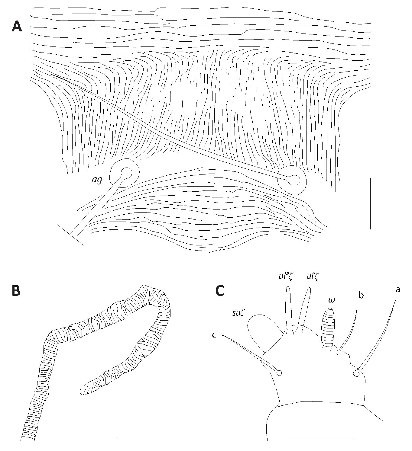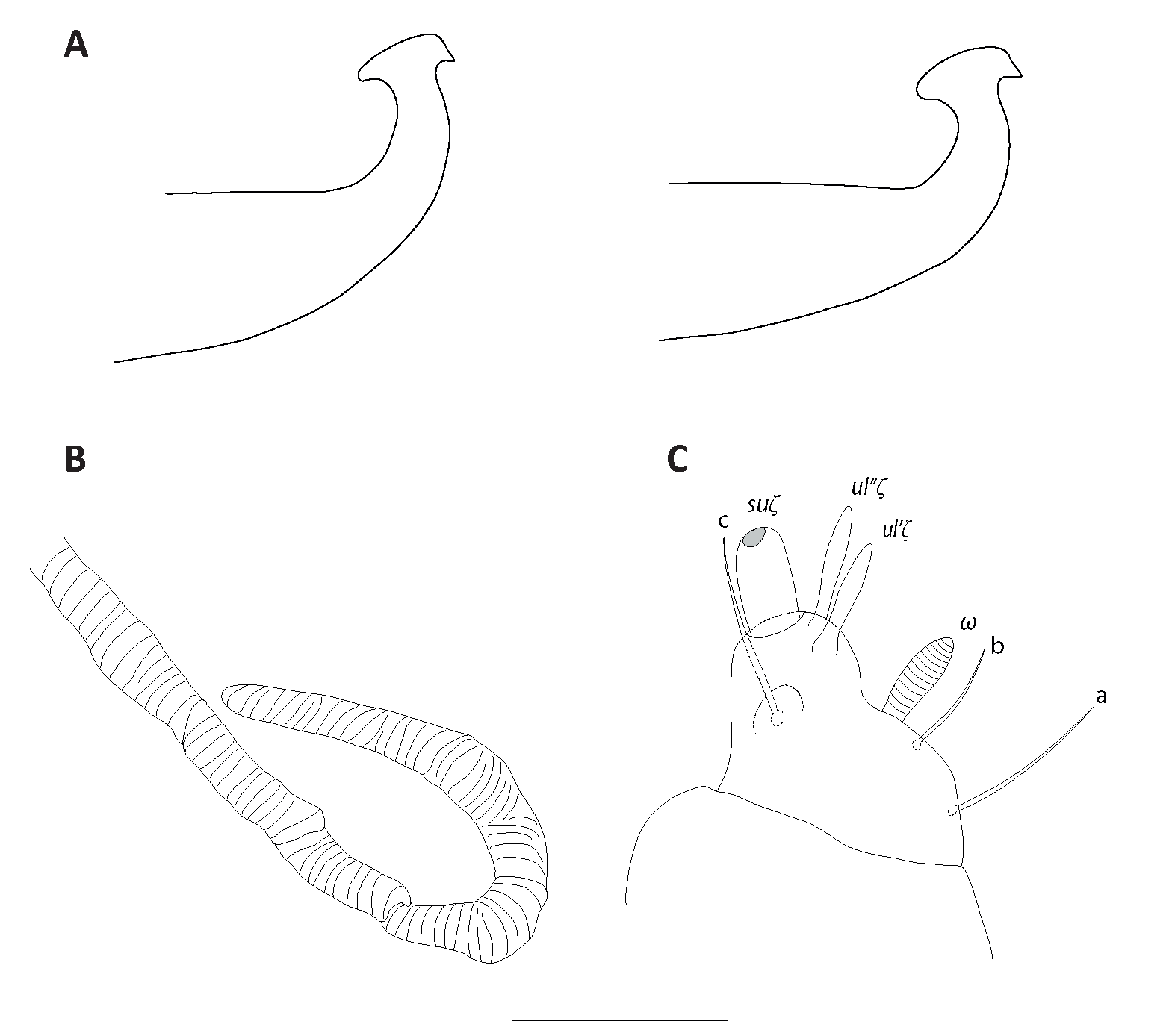 True claws uncinate, each claw and empodium I with one pair of tenent hairs (Fig. 4E), other empodial pads each provided with two rows of tenent hairs (Fig. 5D). Coxisternal seta 1b slender 49 (48–60), coxisternal seta 1c shorter 20 (21–28), serrate, stout (Fig. 4D). Solenidion on tibia I 34 (32–35). On femur I, longest seta 31 (33–35). Tarsi III and IV associated setae serrate and approximate with solenidion forming duplex, tactile member proximal and shorter (about ¾ the length of solenidion) (Fig. 5C). Tarsi III and IV tactile and solenidia lengths: 30–33, 38–43 and 33 (30–33), 40 (36–44), respectively. On tarsi I and II unguinal setae (u) with smooth shaft furcate distally, on tarsi III and IV with serrate shaft and deeply furcate distally. Tectal setae (tc′–tc″) smooth, elongated, slender on tarsus I, with smooth shaft furcate distally on tarsi II and III (may be serrate on tarsus III), serrate and furcate distally on tarsus IV.