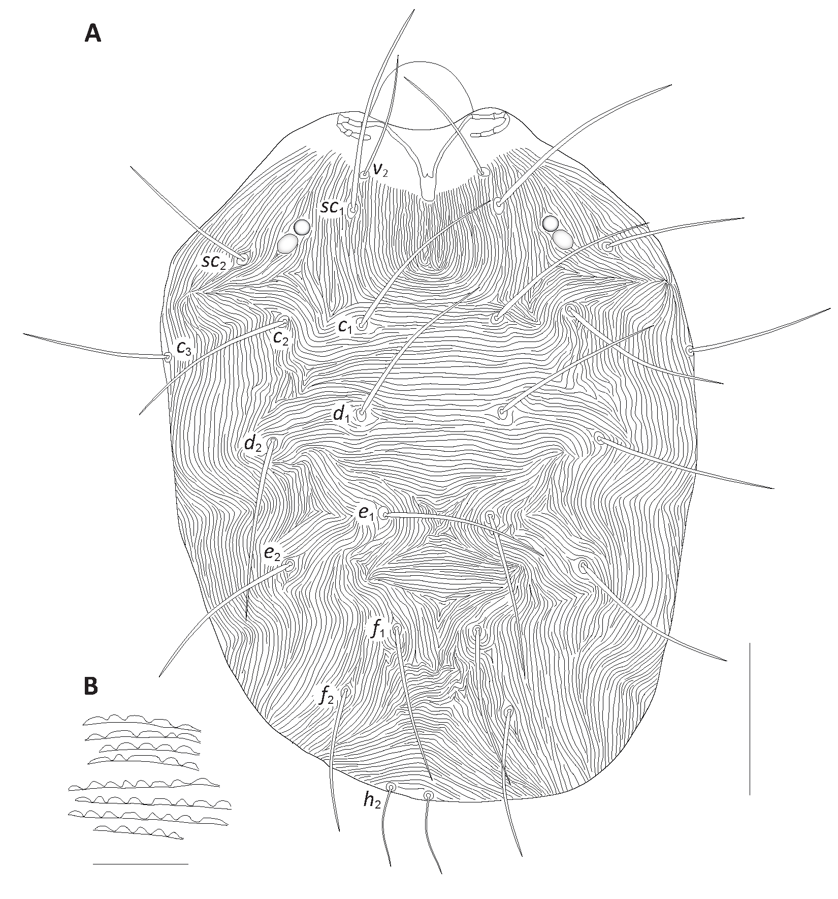 Dorsum – Dorsal body setae lanceolate, longer than distances between bases of consecutive setae: v2 76–87; sc1 131–138; sc2 95–100; c1 115–123; c2 112–123; c3 102–108; d1 115–123; d2 118–124; e1 110–115; e2 113–119; f1 87–102; f2 88–96; h2 47–46. Propodosomal striation longitudinal mostly with rounded and oblong lobes, rare triangularly rounded lobes present. Hysterosomal striation transverse except between setae e1–e1 and f1–f1 (longitudinal) bases forming diamond-shaped pattern between these setae, lobes on dorsal striation variable, rounded, triangularly rounded, as tall as broad to oblong (Fig. 19A–B).