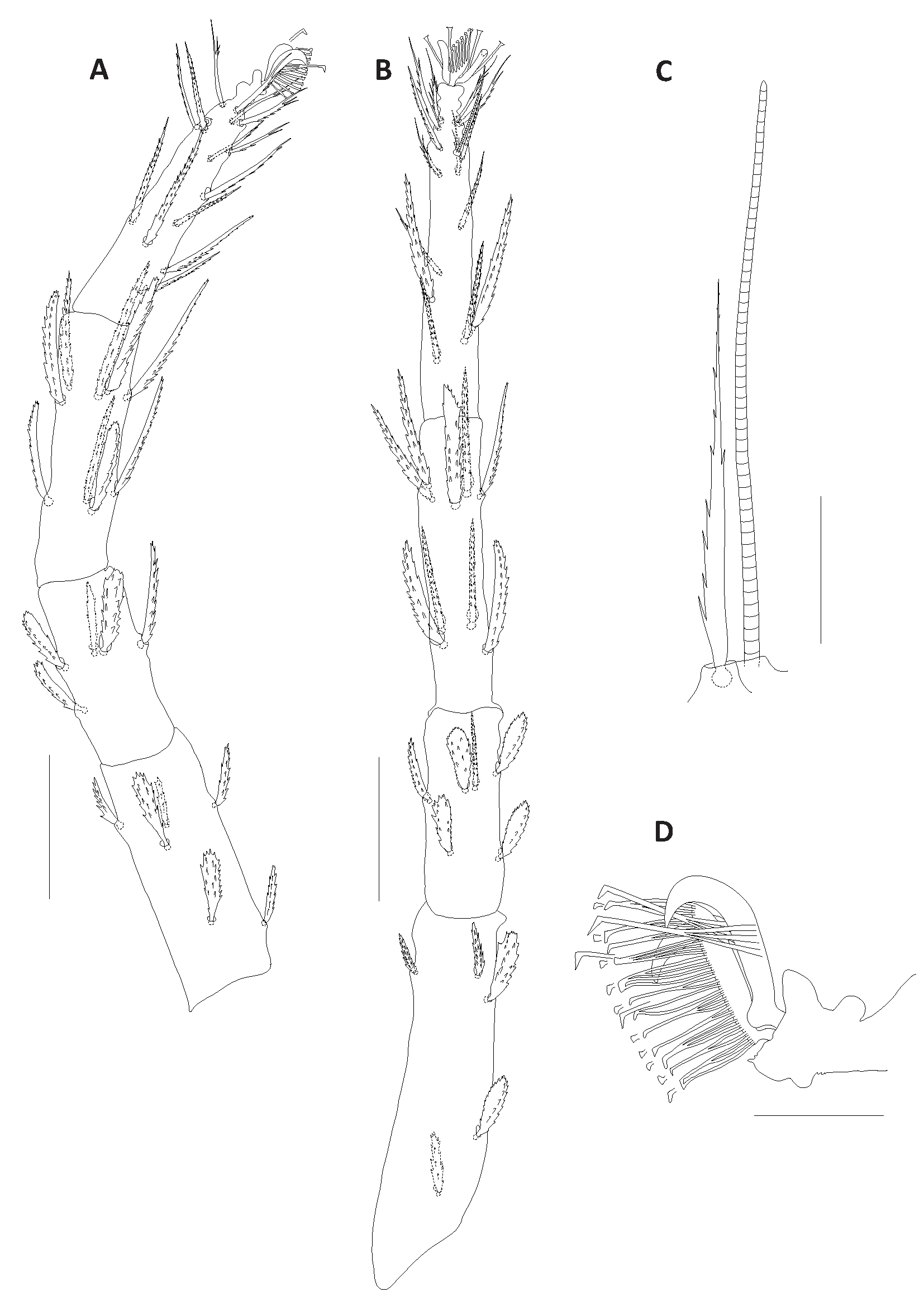 Legs – Leg I longer than body length, other legs inferior to body length. Leg I 964 (966–1044) long (measured from femur to tarsus) about 2.5 longer than leg II 378 (377–411), leg III 355 (357–409), leg IV 454 (453–497). Length of segments of leg I as follows: trochanter 48 (45–49), femur 362 (356–400), genu 129 (127–140), tibia 323 (311–356), tarsus 150 (140–163). Tibia I at least twice the length of tarsus I, femur I almost three times longer than genu I. Ratio between tibia I and tarsus I, and between femur I and genu I 2.15 (1.96–2.35) and 2.8 (2.6–3.1), respectively. Leg setal counts as follows (Figs. 4A–D, 5A–B):
