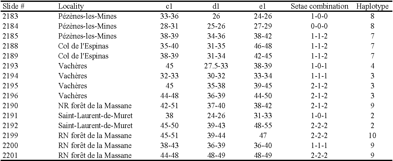 Among the 30 sequences we managed to recover 15 vouchers specimens. For each of them we measured the lengths of the pairs of dorsocentral setae c1, d1 and e1 and categorized them in short, medium or long. We did not observe any link between setal lengths and haplotypes (Table 2 and Fig. 16B), nor between setal lengths and origin of the mites, which reinforce the conspecific character of all the specimens examined.