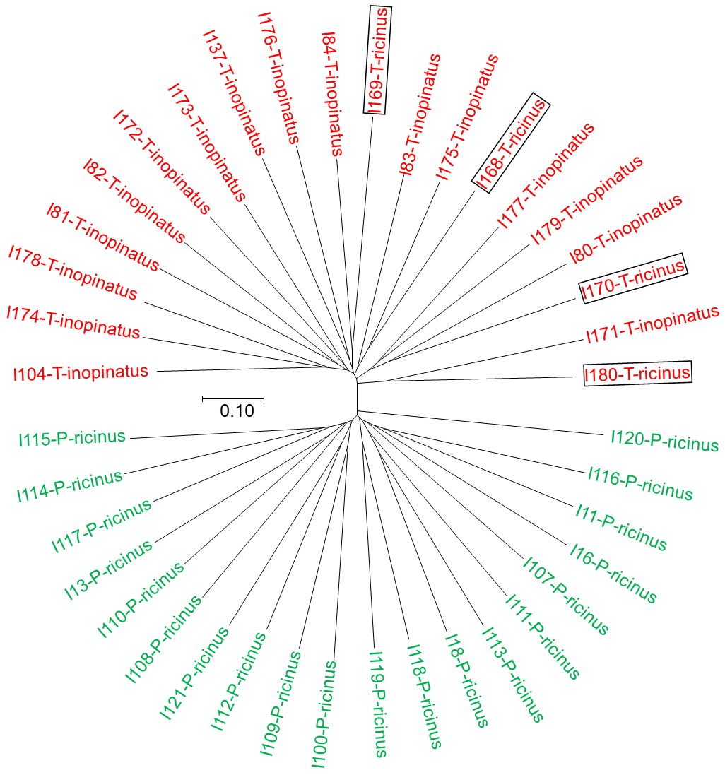 Therefore, based on preliminary data, it is possible to conclude that populations from northern Portugal and Tunisia are likely to belong to different species, as suggested by earlier studies. Indeed, microsatellite genotyping (De Meeûs et al. 2002), nuclear phylogenies (Noureddine et al. 2011), and SNP analyses (Poli et al. 2020) have already revealed the occurrence of a deep split between North African and European populations. In accordance with other authors, it was confirmed that adult I. inopinatus and I. ricinus cannot be differentiated by morphology (Younsi et al. 2020), but also not by 16S rRNA gene analysis, because all our Tunisian sample, which included both putative species, belonged to the same population when analysed with microsatellite markers.