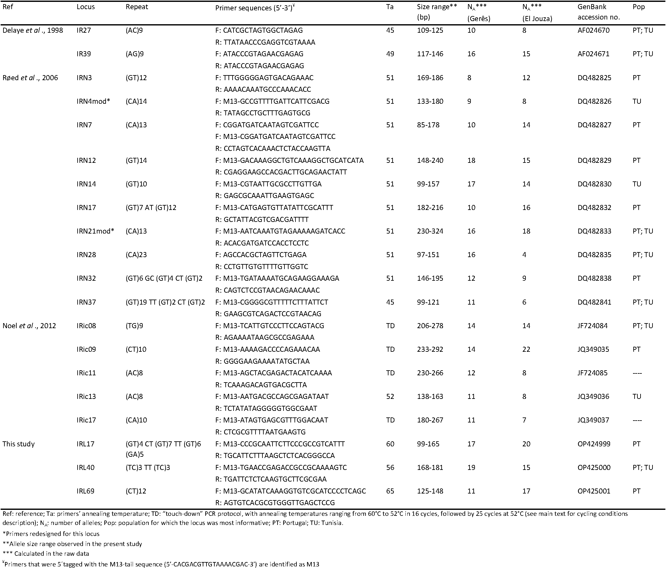 Coming back to the raw data and all 20 loci, there were indeed private alleles in most loci, except for IRic13 and IRic17, for which frequent alleles (p ≥0.1) were never private. For IRN32, only rare alleles could be found in common and locus IRN28 was diagnostic between the two subsamples (no allele in common). Clade analysis in STRUCTURE estimated a maximum possible introgression of alleles from Portugal in Tunisia of less than 3%, and less than 2% for Tunisian alleles in Portugal. Average assignment to its population of origin was 0.9946 and 0.9949 for Tunisia and Portugal respectively. Minimum assignment of individuals was 0.9823 for individuals from Portugal and 0.971 for Tunisia. The detailed description of allele frequencies observed for each locus and population, as well as the results of the STRUCTURE analysis, can be found in supplementary tables S5 and S6.