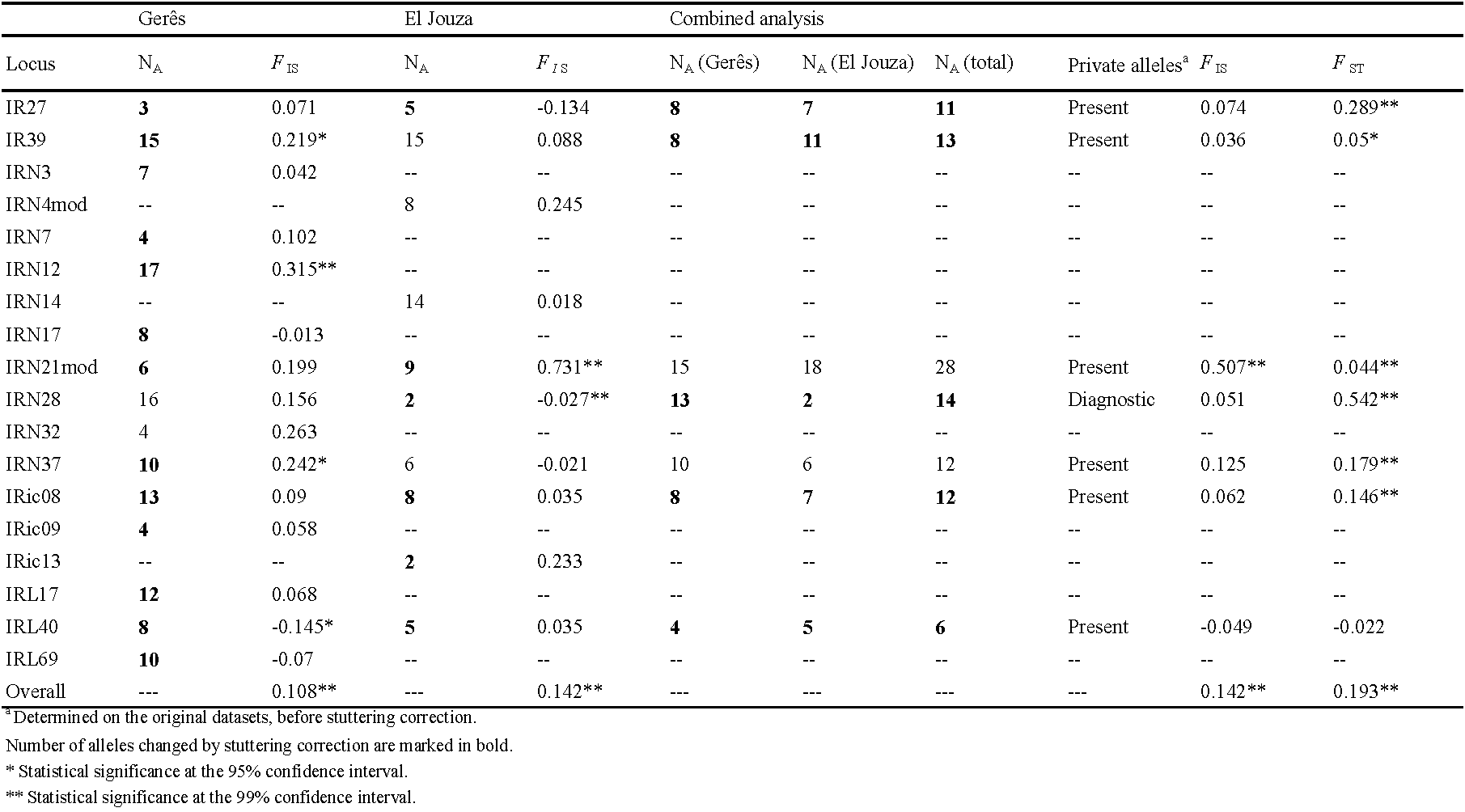 This analysis was made with loci that were in common after locus selection in both sites. Seven loci remained: IR27, IR39, IRN21, IRN28, IRN37, Iric08 and IRL40. We directly tried to correct for stuttering and the result is shown in the allele pooling table S4, provided as supplementary material. Correction worked well for all loci but IRN21 and IRN37. Corrections were kept for the other five loci and kept IRN21 and IRN37 unchanged.