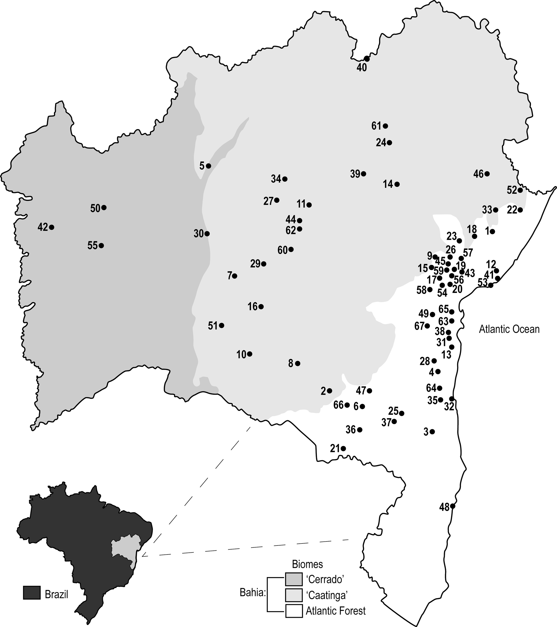 The Bahia state territory is located in the Northeastern region of Brazil, that includes three natural biomes that are characterized by different physical and biological characteristics, such as soil, rainfall, and vegetation (Santos et al. 2018): (1) the ''Cerrado'', which is considered the Brazilian savannah (Ratter et al. 1997); (2) the ''Caatinga'', a typical, semi-arid biome (Sampaio 1995; Costa et al. 2007); and (3) the Atlantic Forest, a dense ombrophilous forest in the coastal region of the state (Câmara 2003).