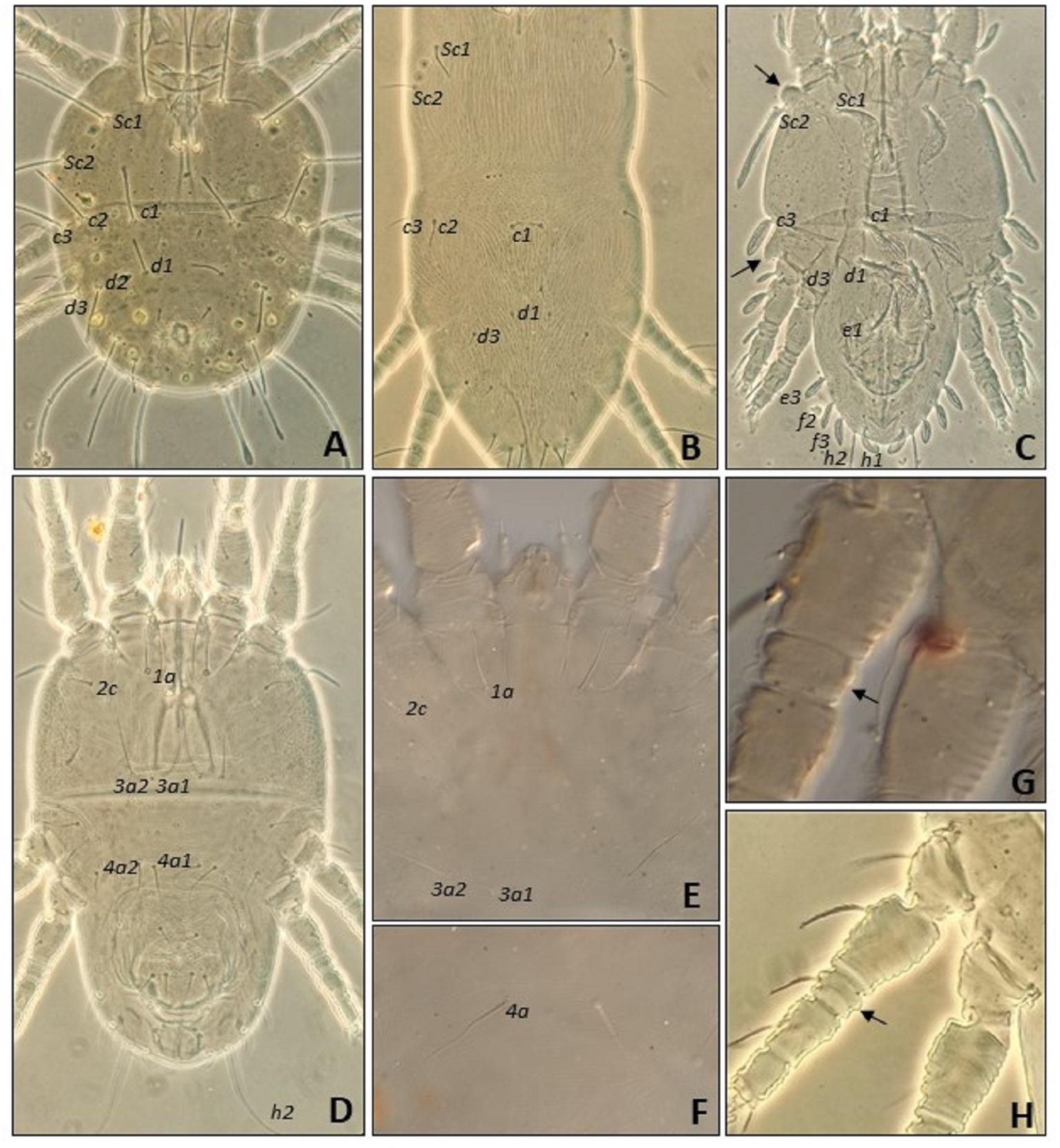 — Dorsocentral setae flattened (c1, d1, e1 and h1) and much larger than dorsolateral seta (c3, d3, e3, f2, f3 and h2) (Figures 4E, G); tarsus II with one solenidion (Figure 4F); spermatheca vesicle oval, with fine walls, without distal projections, and no internal bubble (Figure 4D)