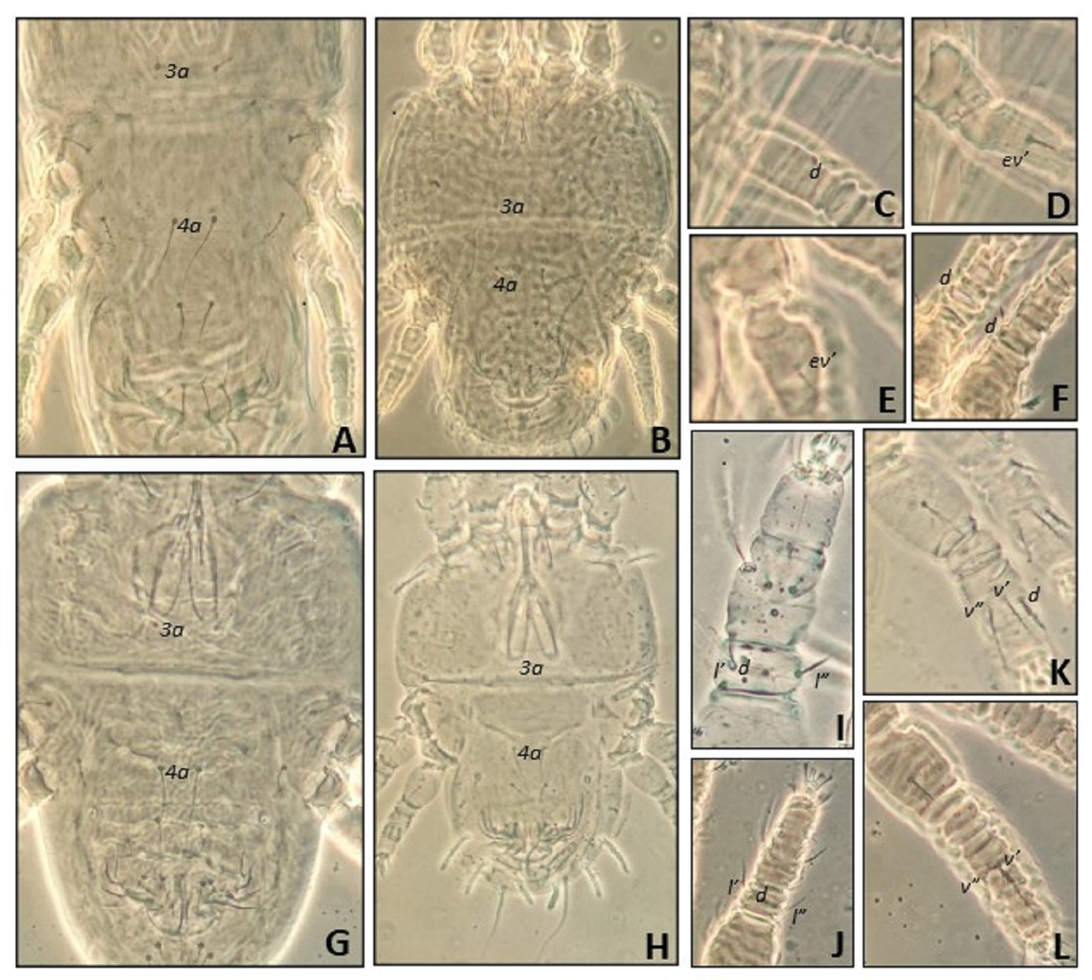 6. Coxisternal region with two pairs of setae 4a (4a1 and 4a2) (Figure 2D); genu III with one seta (Figure 2H)