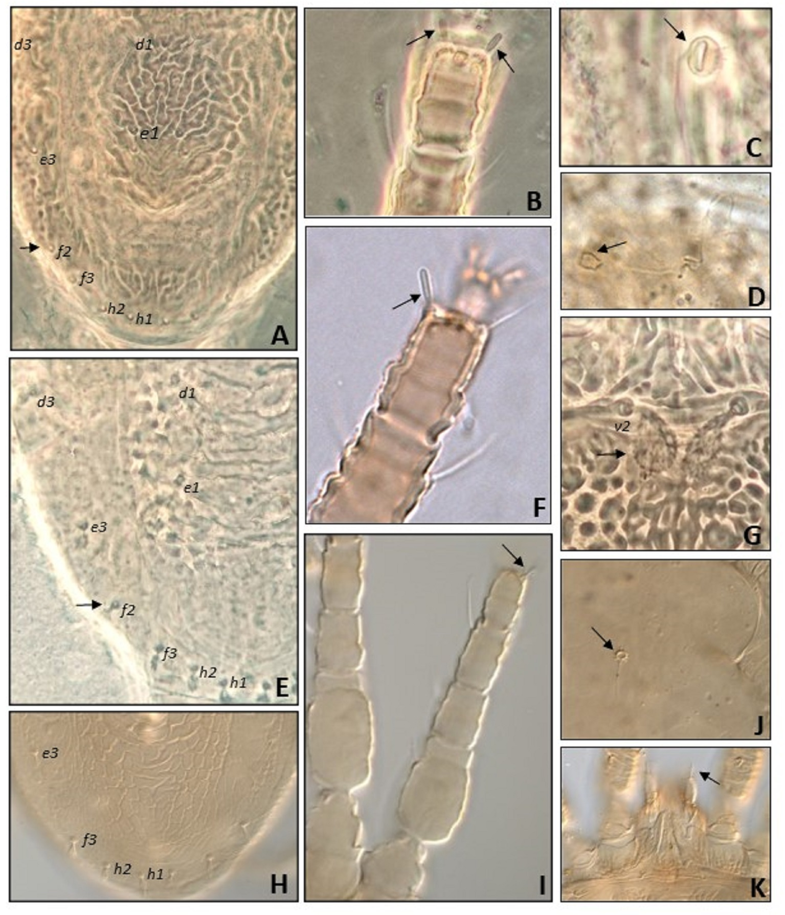 — Genua I and II with three setae each (d, l′ and l″) (Figures 3I, J)